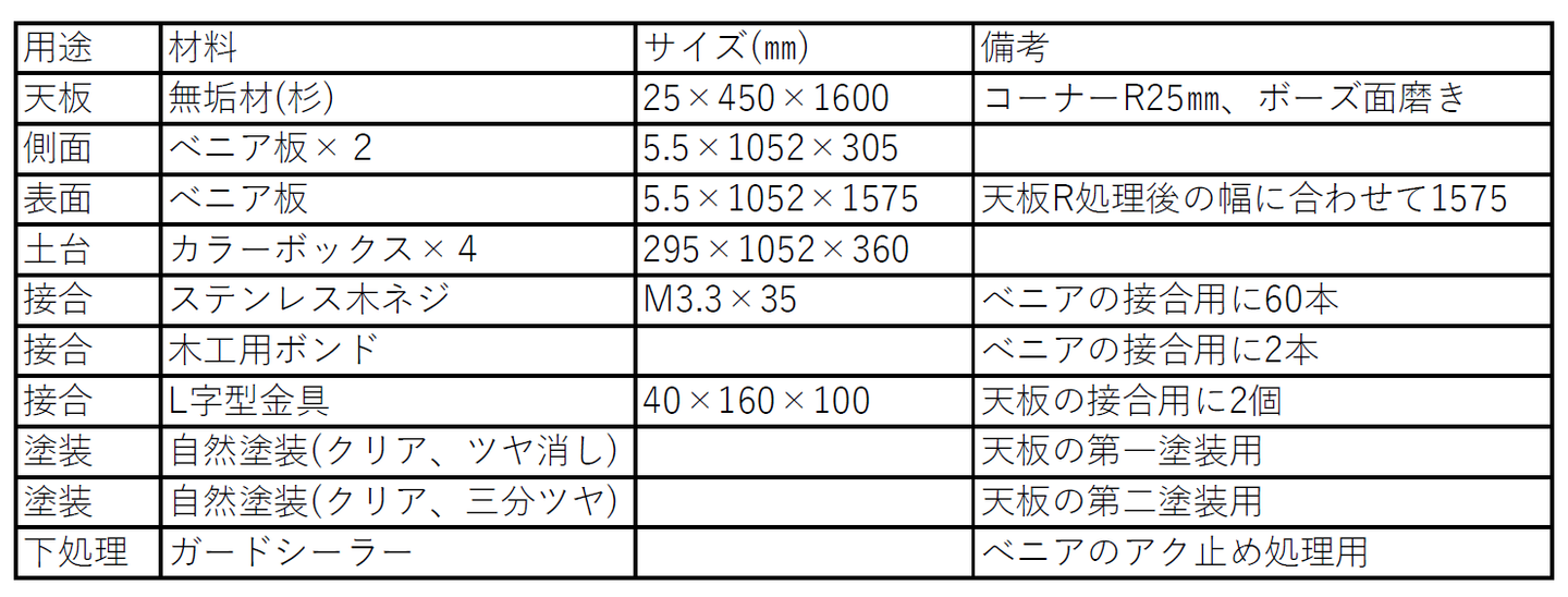 調査した結果、カラーボックスと天板を接合したら作れるんじゃないかということで、下記材料で作ることにしました!