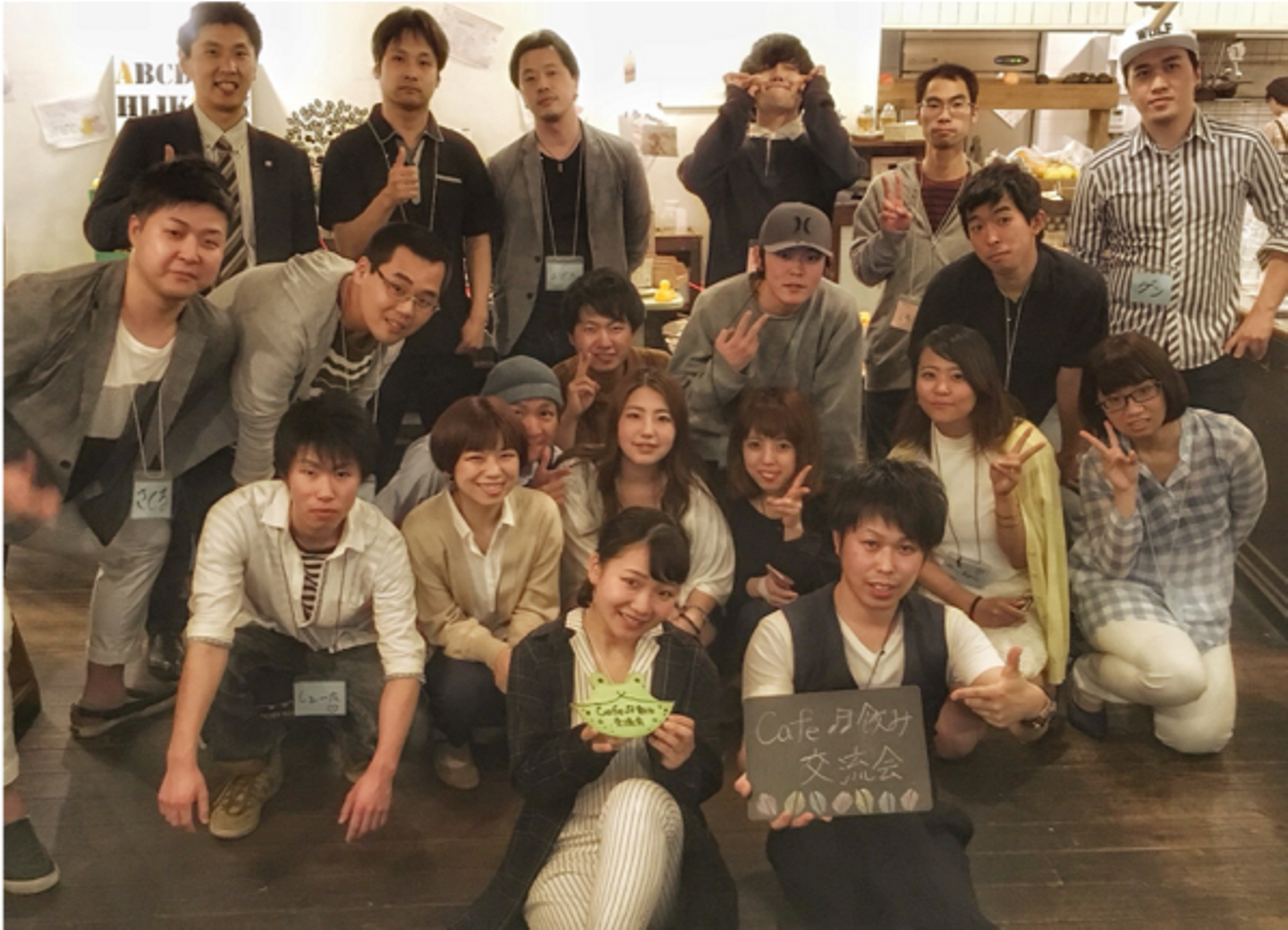 (先日参加した交流会での画像です。中央で顔をつねっているのが私です。)