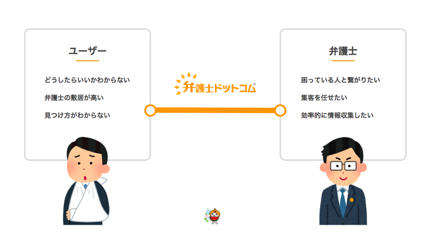 高橋「弊社の主力サービスは、一般ユーザー向けには“みんなの法律相談”。弁護士向けには“弁護士向け有料サービス”です。サービス利用者としては、大きく二種類存在していて、両者をマッチングするための“弁護士検索サービス”にも力を入れています」