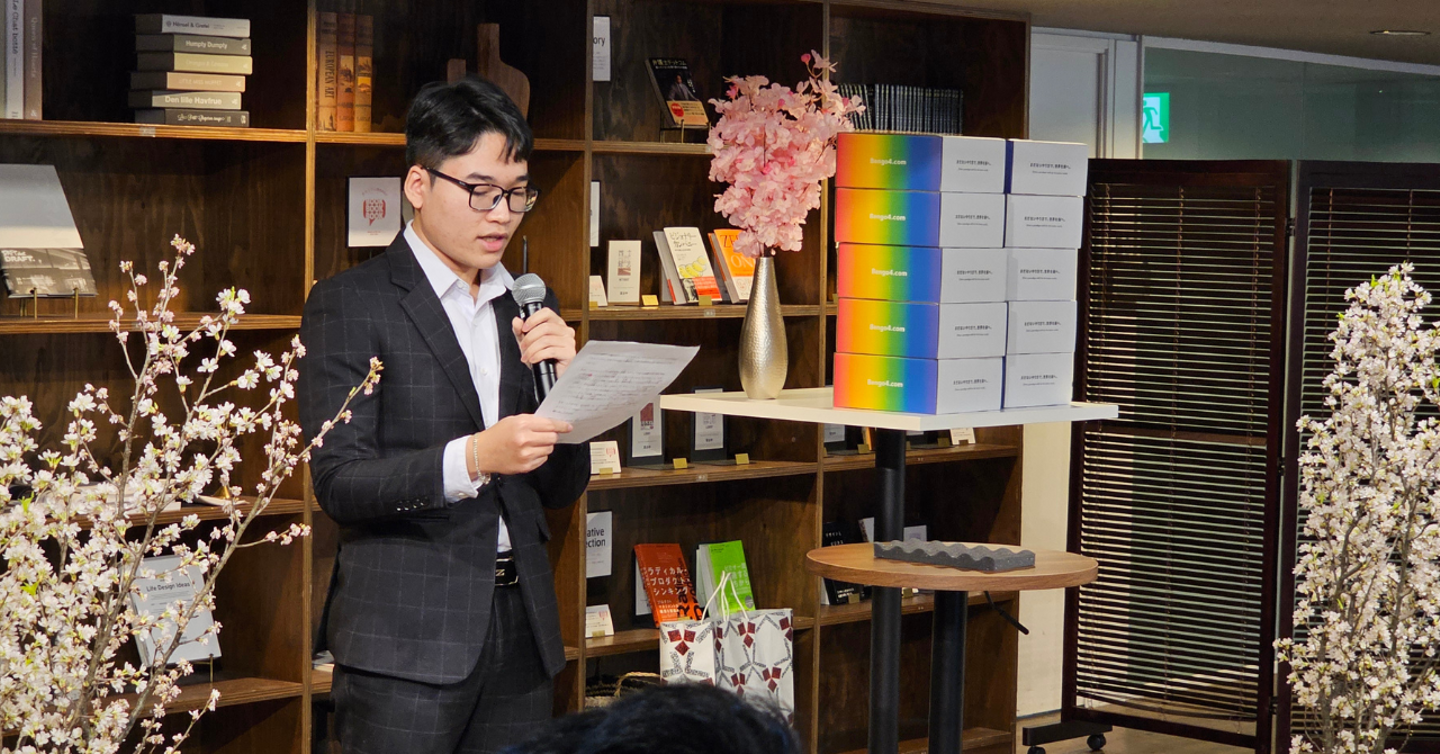 ブゼル・ヤビンドラさんは、徳島での学生生活、交通事故を乗り越え東京へ挑戦する決意、情報格差への問題意識、そして周囲への感謝を述べました。また、「未来をつくる」一期生としての自覚、連携への誓い、日本とネパールを繋ぐ架け橋となる将来の展望を力強く宣言し、会社への感謝と貢献への決意で締めくくりました。