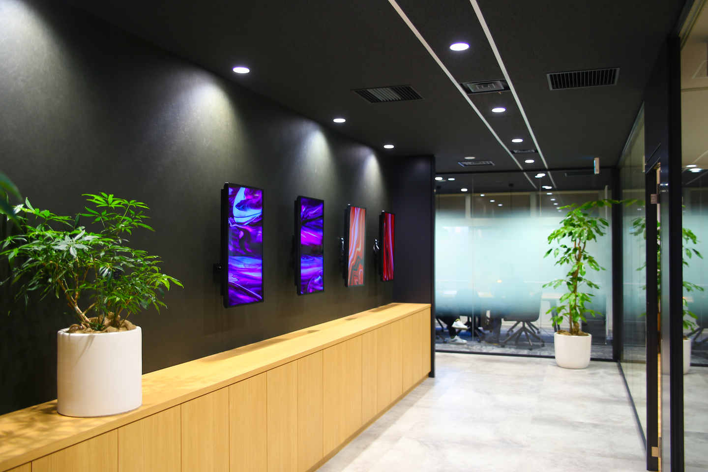 エントランスから直線に伸びる通路には、デジタルサイネージを設置しています。用途は主にオフィスを訪れたお客様に向けた企業メッセージやサービス紹介、フロア案内などになります。