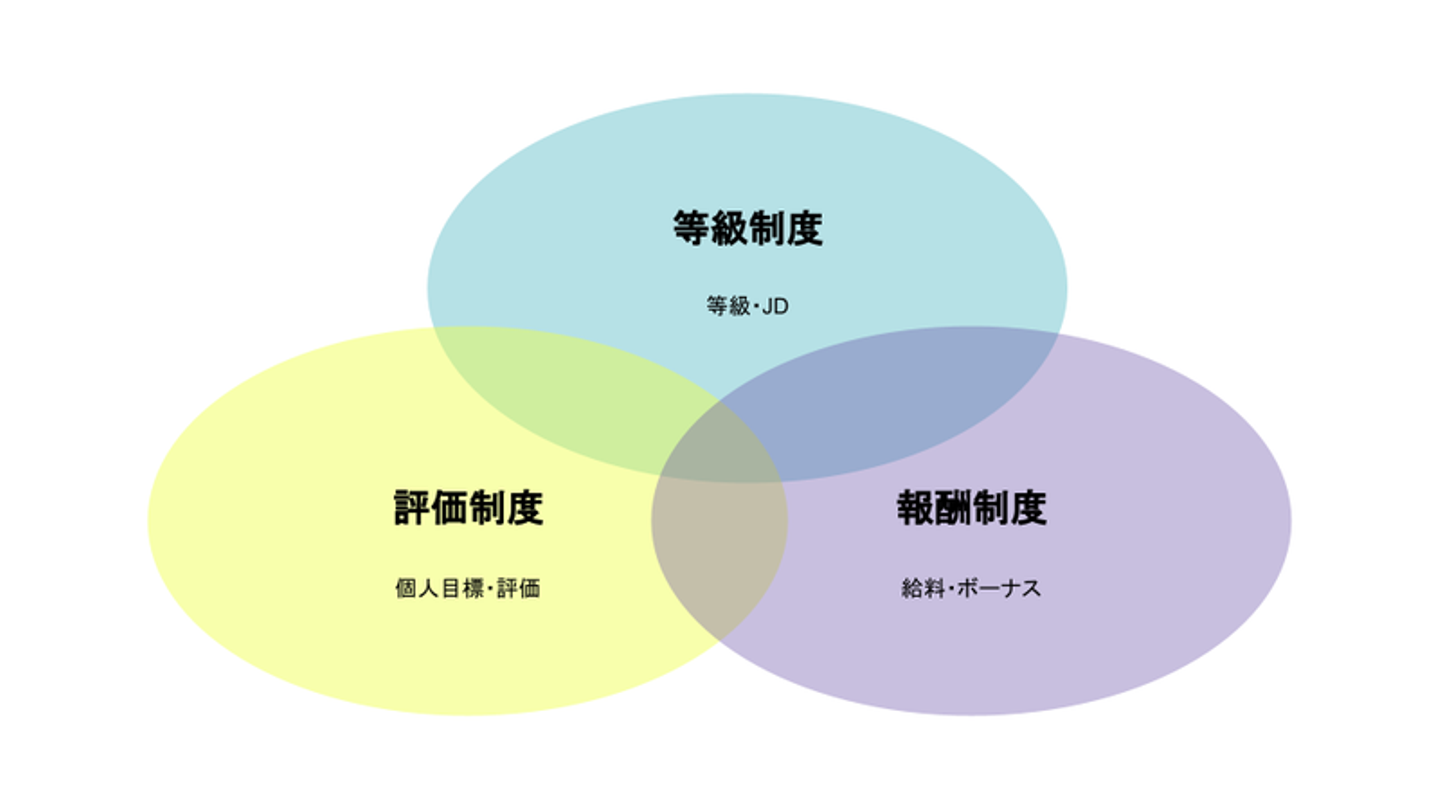 人事制度は大きく分けて等級・評価・報酬の3つから成り立っています。下図の通り、3つの構成要素にはそれぞれに対応してJD(ジョブディスクリプション),等級,個人目標,評価,給料などが含まれます。