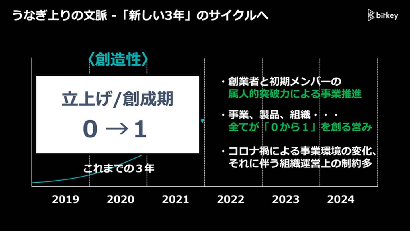 2019年から2021年の最初の3年間は「創成期」であり、私も含めた数人のメンバーによる属人的な突破力で事業を推進してきました。本当に「0→1」を多く創造してきた3年間であったと言えます。まさしく、事業を「立ち上げ、生き残る」ことが最優先でした。