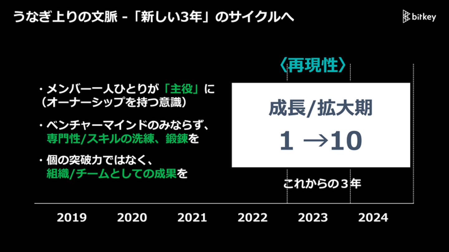 江尻:そして、2023年は「成長/拡大期」の2年目にあたります。この3年間の「ど真ん中」をどう過ごすかが、ある種の分水嶺と言っても過言ではありません。ビットキーにとって重要な年だと思っています。そんな今年1年のテーマを発表します。
