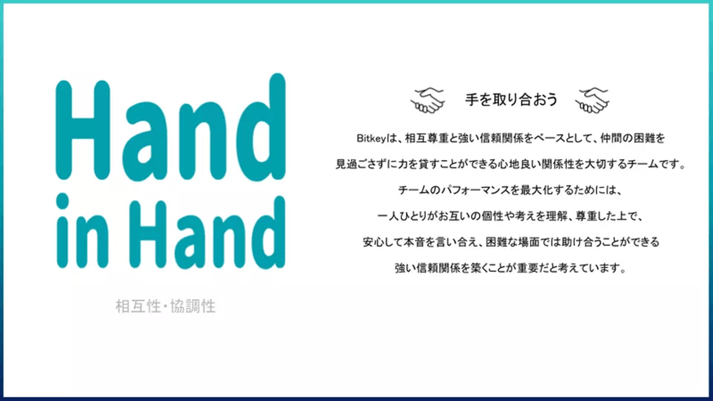 次なるステージとしては、個の突破力ではなく、 組織やチームとしての成果にこだわってもらいたい。ビットキーが大切にする3つのValueのうちの「Hand in Hand」を、最重要Valueにしてもいいと思っています。