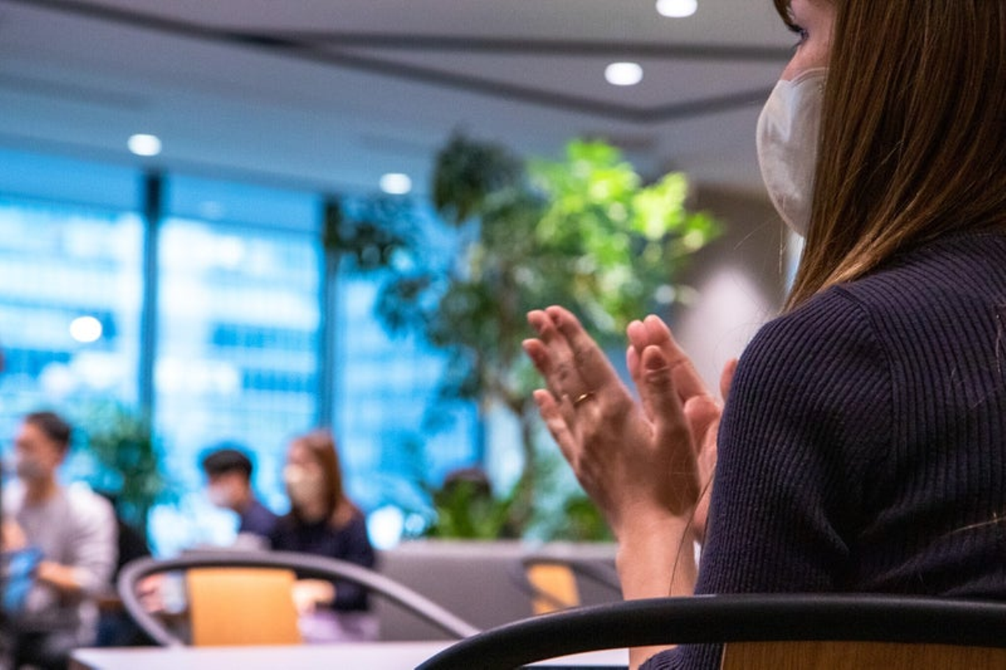 ビットキーのキックオフは、CEO江尻から全社共通となる「年間のテーマ」が発表されます。東京のオープンスペースをメイン会場に、各拠点(東京/宮崎/大阪/福岡)もオンラインで中継。リモート勤務のメンバーもオンライン参加ができるよう、感染対策を講じながらオンライン/オフラインのハイブリット形式で開催しています