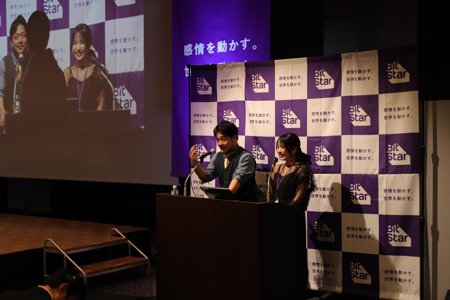 続いて、BitStar Awardの表彰式が行われました。BitStar Awardは、11期上半期に優秀な成績を収めた社員を表彰する制度です。下記、8つの賞が設けられており、受賞者はご自身の好きな音楽と共にレットカーペットを堂々と歩き、壇上で代表取締役の渡邉社長から賞状と賞金パネルを受け取り、受賞の喜びを語りました。