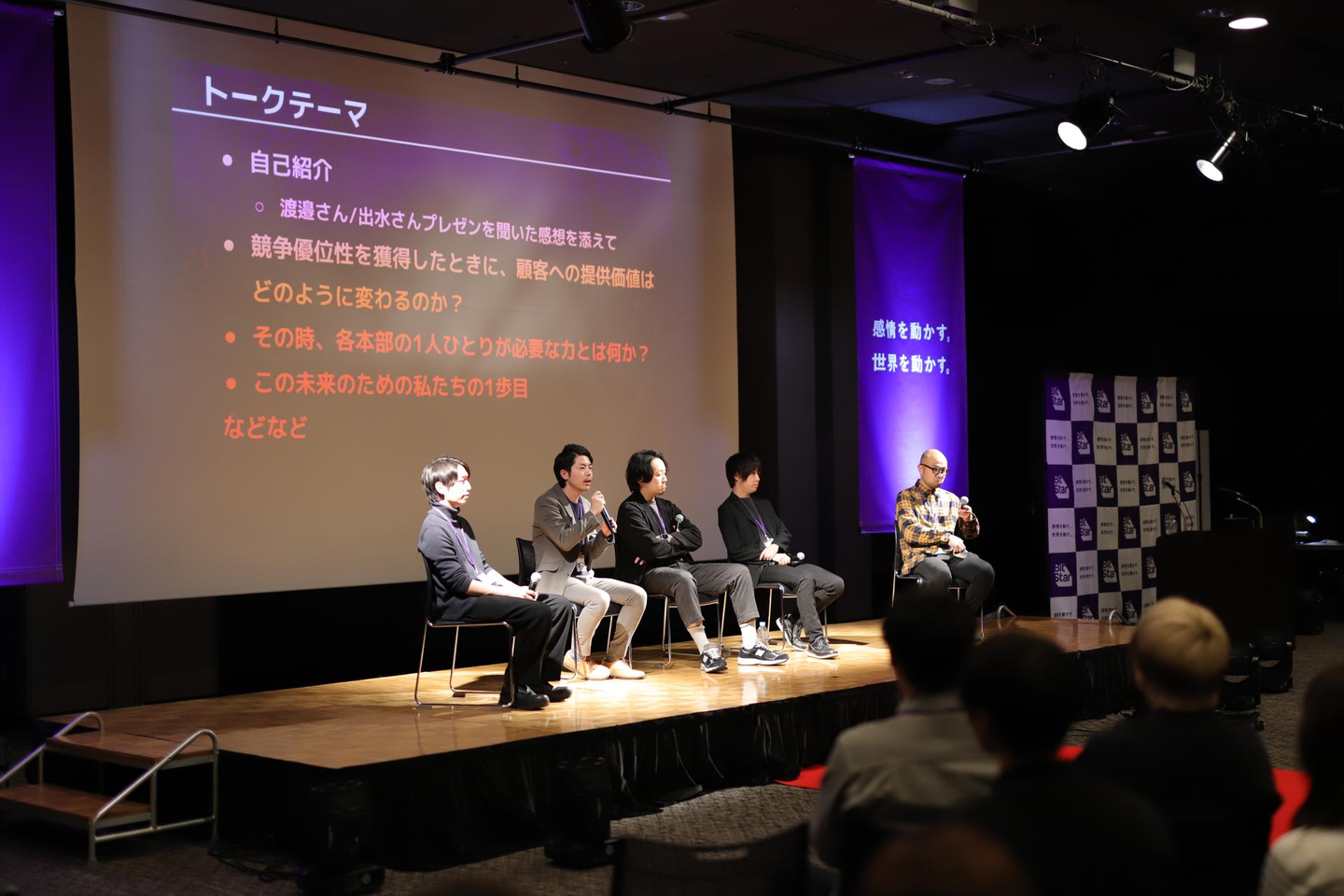 渡邉社長と出水さんの発表を受け、全体ワークとして3人1組でトークテーマに沿ってディスカッションし、その後、部署代表メンバーの登壇による『パネルディスカッション』が行われました。
