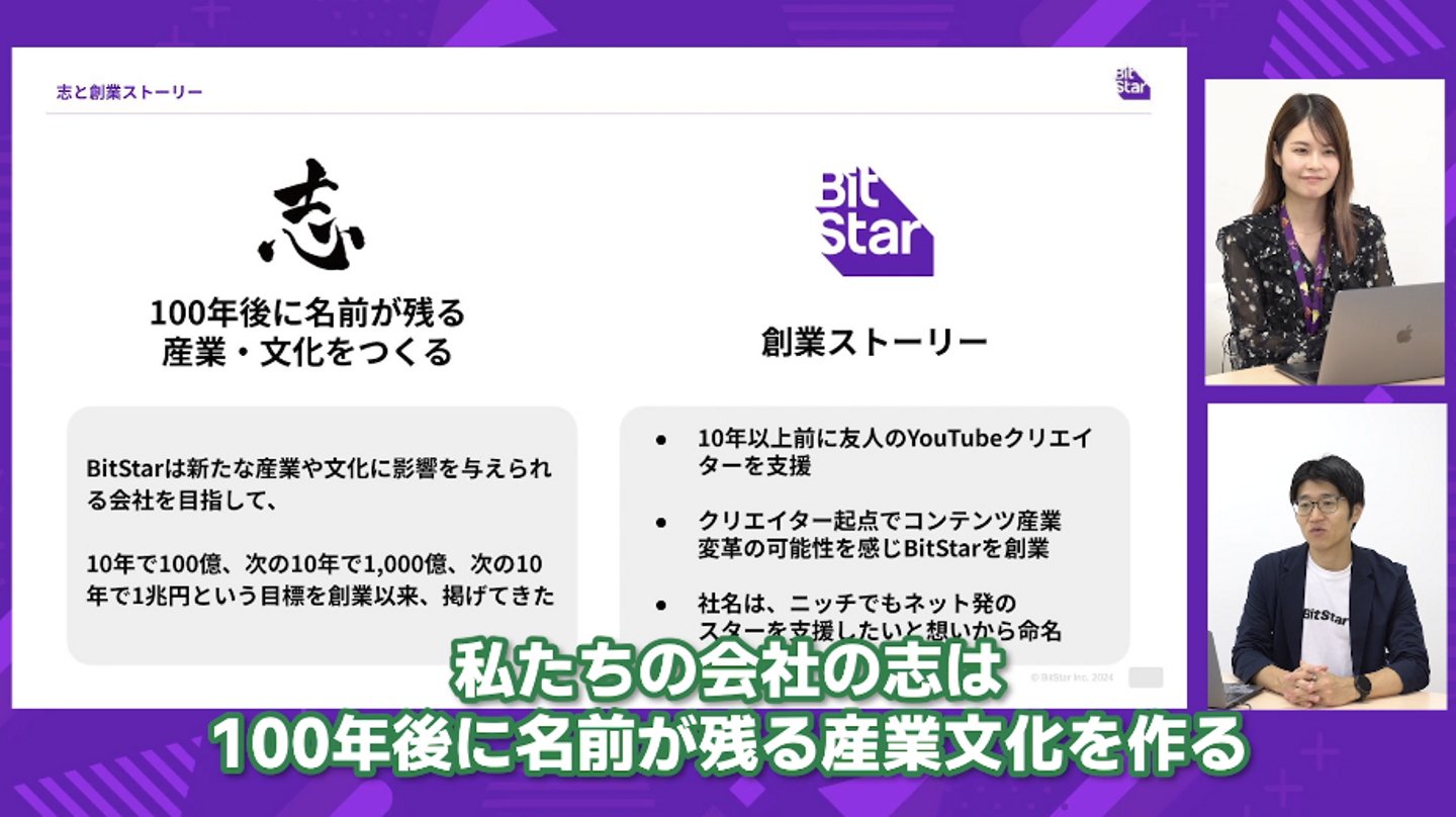 創業に関しては、10年以上前に友人のYouTubeクリエイターを支援したことをきっかけとして、コンテンツ産業、広告業界といった領域は大きく変革しそうだなっていう可能性を感じてBitStarの事業を立ち上げております。社名自体は、渋谷がビットバレーと言われるように、ネット発だったりとか、英語で直訳すると「ニッチな」とか、小さな人たちでも活躍できるような時代を創りたいと。そういう思いで、BitStarという社名を付けております。