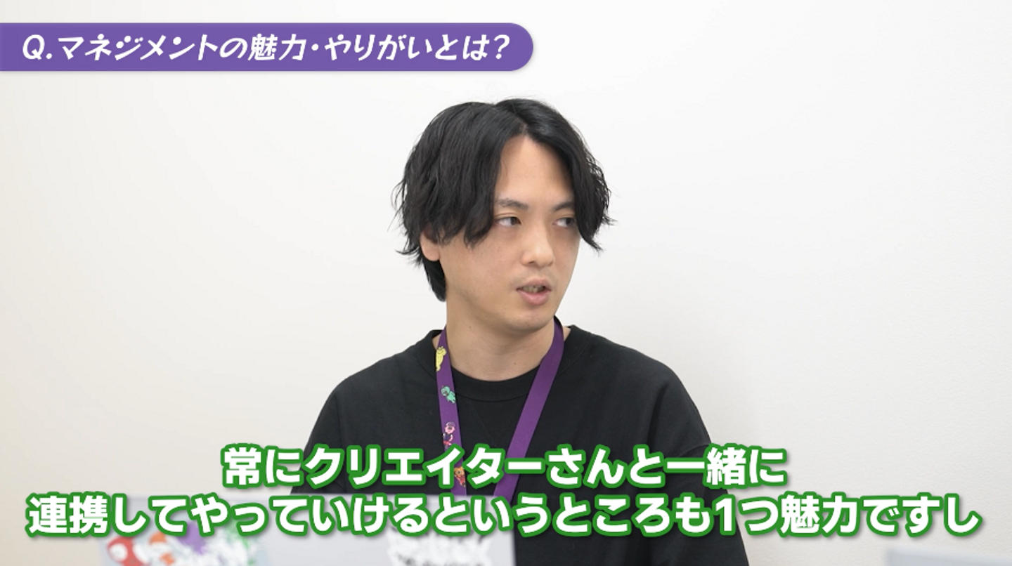 単にやりたいことを叶えてあげるだけでなく、そのクリエイターさんの「人生を背負っている」という意識を持ちながら、2年後、3年後といった中長期的な目標設定をきちんとマネージャーがしてあげて、クリエイターさんと目線合わせをしながら、そのゴールに向かってロードマップを引き、引っ張っていけるような、マネージャーというよりもプロデューサーのような思考を持っていただける方を求めています。