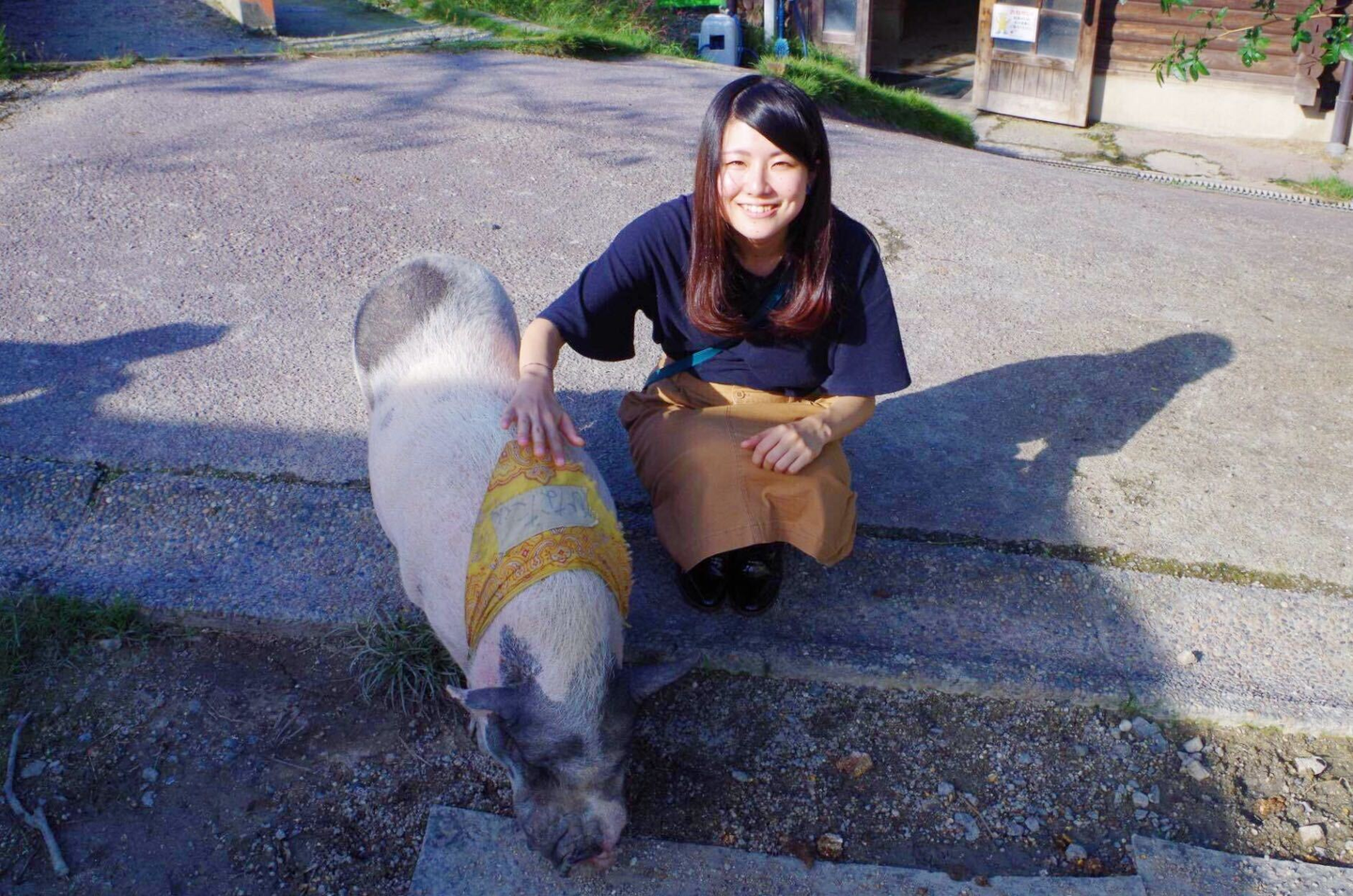 三重県の伊賀の里モクモク手づくりファームにて。ミニ豚のひなたくんと。