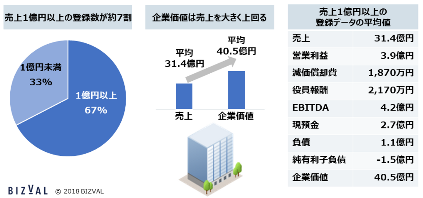 現在登録されているデータのうち、約7割が売上1億円以上の企業です。