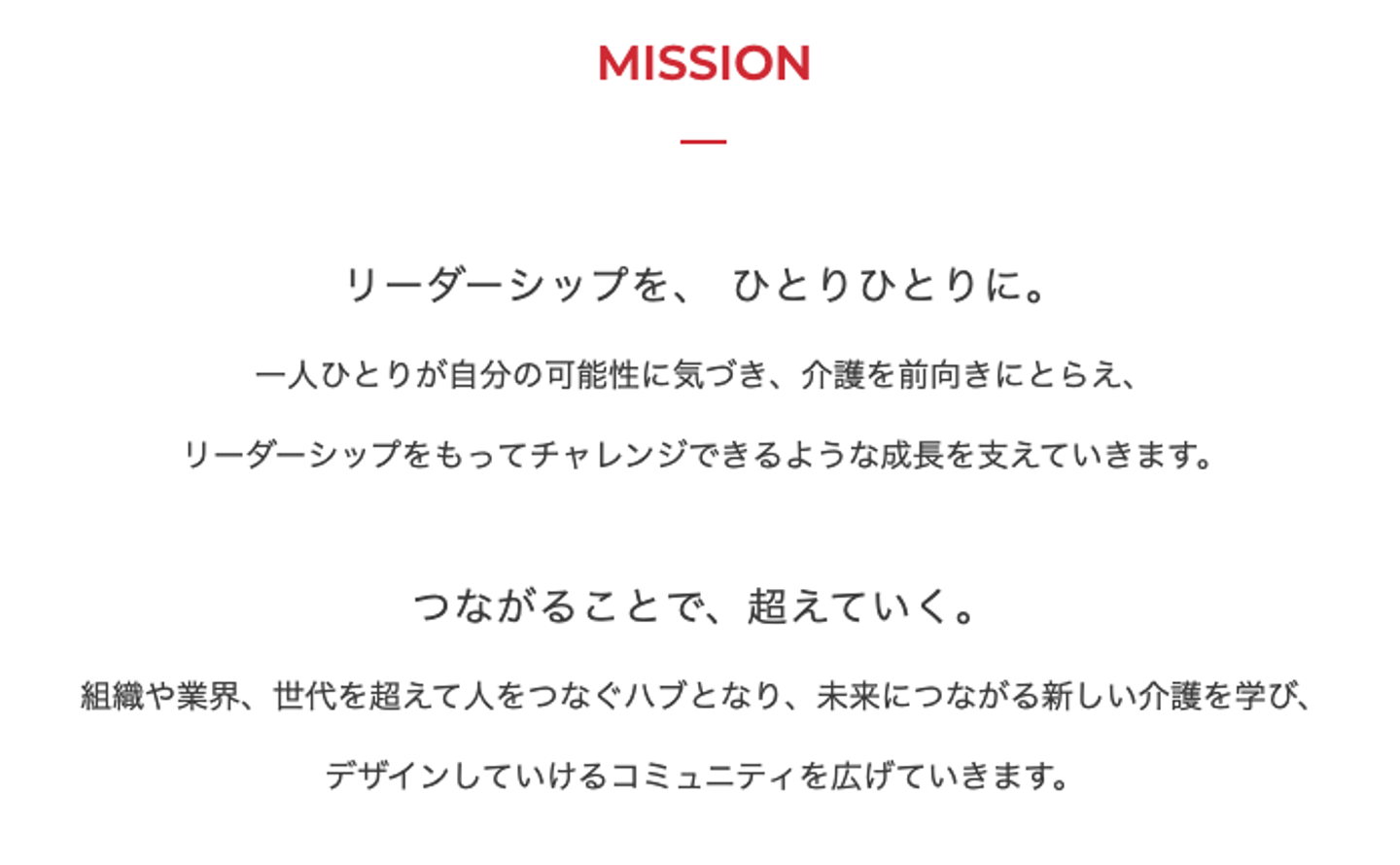 「リーダーシップ」という言葉の意味はまちまちかと思いますが、語源である”leith”には「境界線を越える」っていう意味があるらしいんです。僕はこの境界線を越えていく、例えば「行けなくなった喫茶店を諦めるんじゃなくてもう一回行ってみる」とか「はじめてやることには不安とか恐怖とかあるけど、それでも一歩踏み出してみる」姿勢が好きで、それを応援したいと思っています。その一歩のことを僕は「聖なる一歩」と表現をしているんですね。この「聖なる一歩を踏み出していく人たちが増えて欲しい」という想いがKAIGO LEADERSの「リーダーシップを、ひとりひとりに」というミッションに、近いと思ったんです。