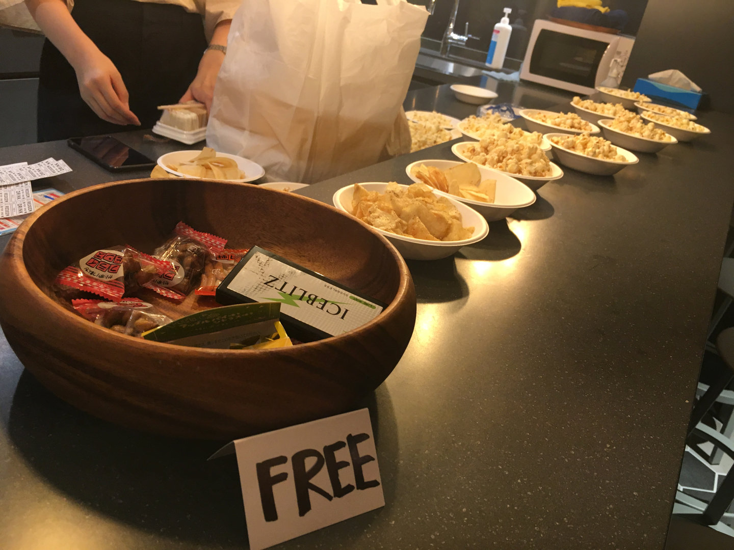 いつも置いてあるFREEお菓子に加えて、ポップコーンにポテトチップス・・・
