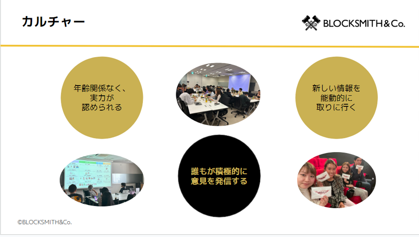 BLOCKSMITHには20代を中心とした若い社員が多く、またメンバー全員の意見が公平に受け入れられる文化があるため、社内には明るい雰囲気が満ちています!