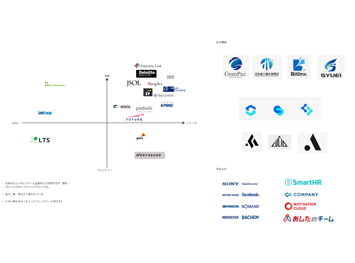 BlueAIがITコンサルやエンジニアリングの会社なので、そのような系列の会社はどういうロゴが多いのか、どういう色が使われているのかを調査。信頼感をイメージづけるブルー系が多い印象です。