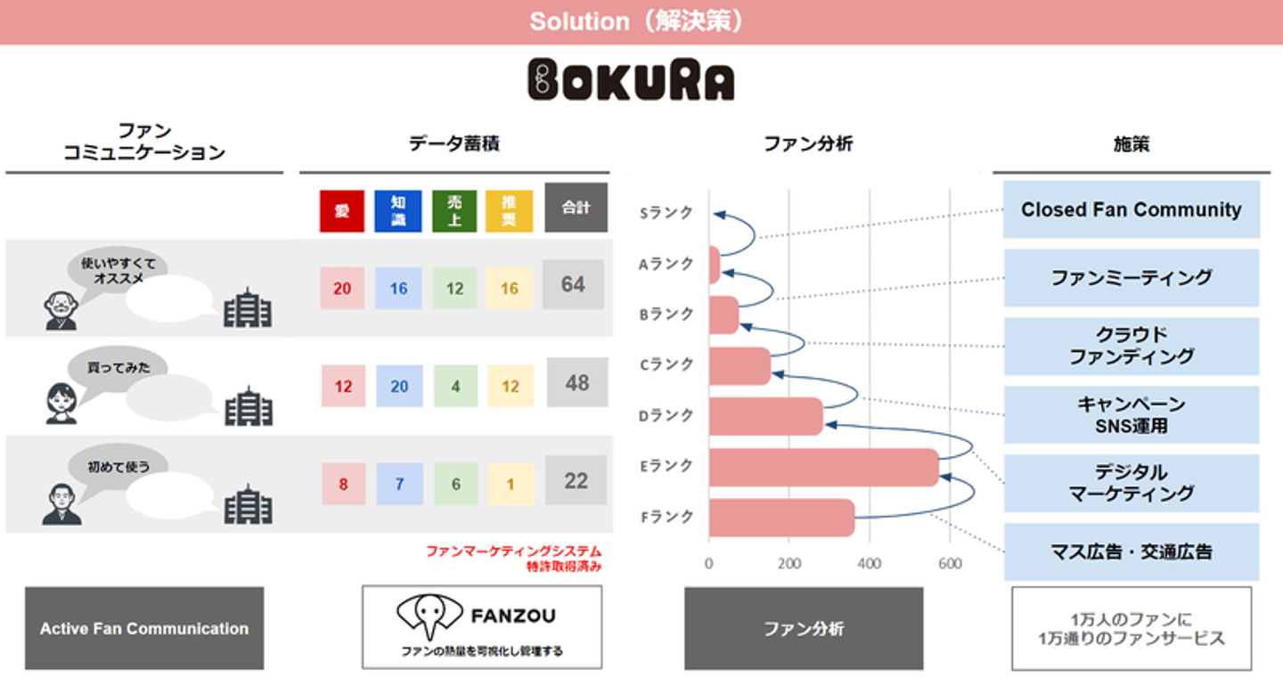 ある程度データが溜まってきたら、そのファンの皆さんへアンケーを投げかけて回答してもらいましょう。Q.使い始めたきっかけは?Q.何が良いと思って使っている?Q.改善して欲しいポイントは?Q.これまでにどれくらい使って(買って)くれてる?Q.使い続けてくれている理由は?Q.友人や知人に推奨したことはある?Q.SNSは利用している?Q.ハッシュタグなどを付けて投稿してくれたことはある?…など、出来るだけ具体的な設問を考えて投げかけてみましょう。そのデータを分析することで、ファンの皆さんがどれくらい好きでいてくれるか、その分類ができるはずです。※勿論SランクやAランクの方々がいるのはありがたいですが、それに準ずるB~Fランクの方々がどれくらいいるのかを把握することも必要。