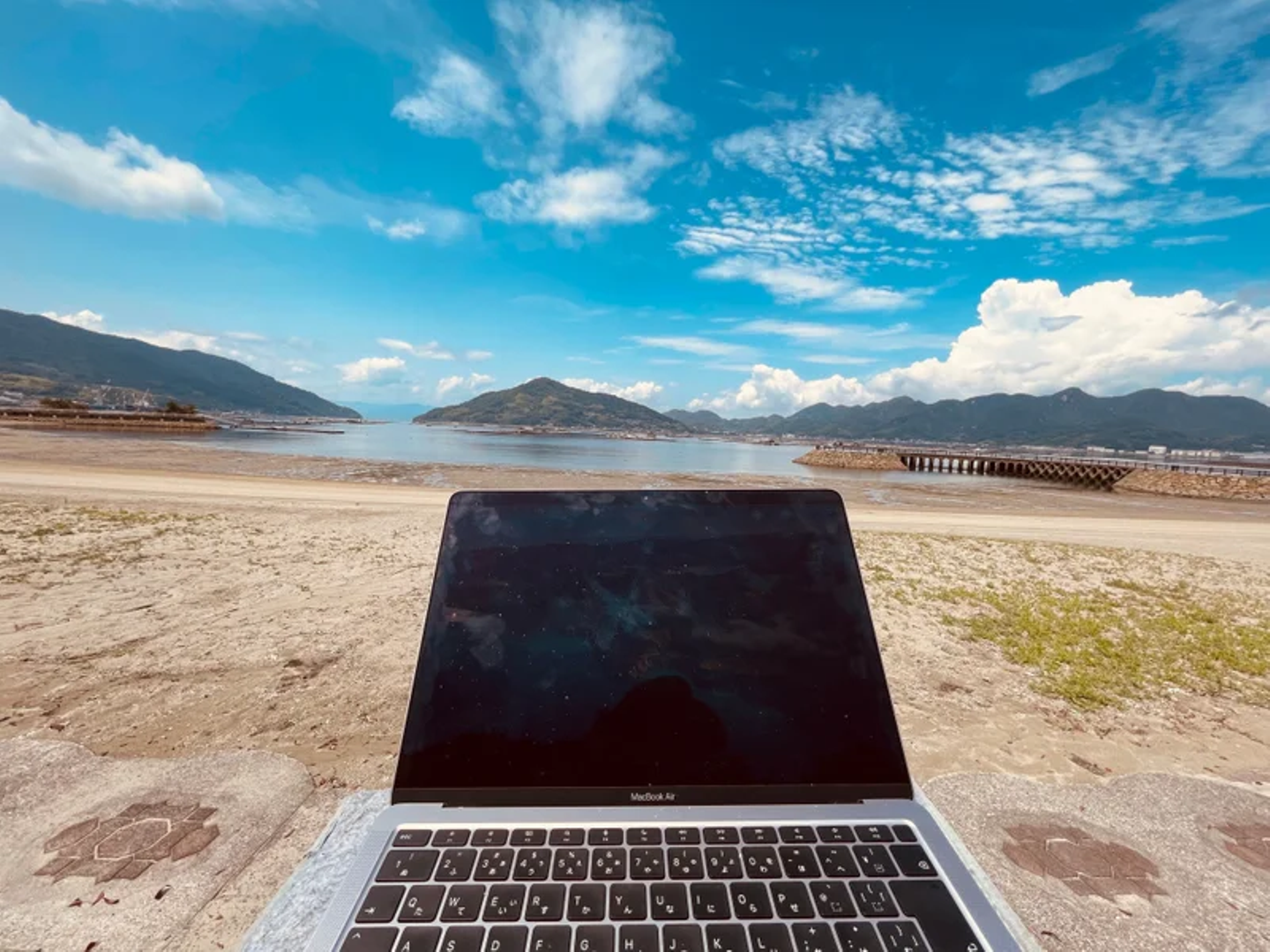 今回、私は宇品港から高速船で15分で行ける江田島を訪れることにしました。江田島は離島らしい素朴な自然も広がる一方で、広島市に通勤・通学に便利なため、お店もいくつか立ち並んでいます。前回、五島列島でのワーケーションしたときも浜辺からの作業が最高だったので、今回も浜辺に行くことにしました。瀬戸内に浮かぶ島々を見ながらの作業はやはり格別でした。浜辺からの帰りには、えたじま温泉にも入り、1日の仕事の疲れも癒すことができて最高の滞在になりました。