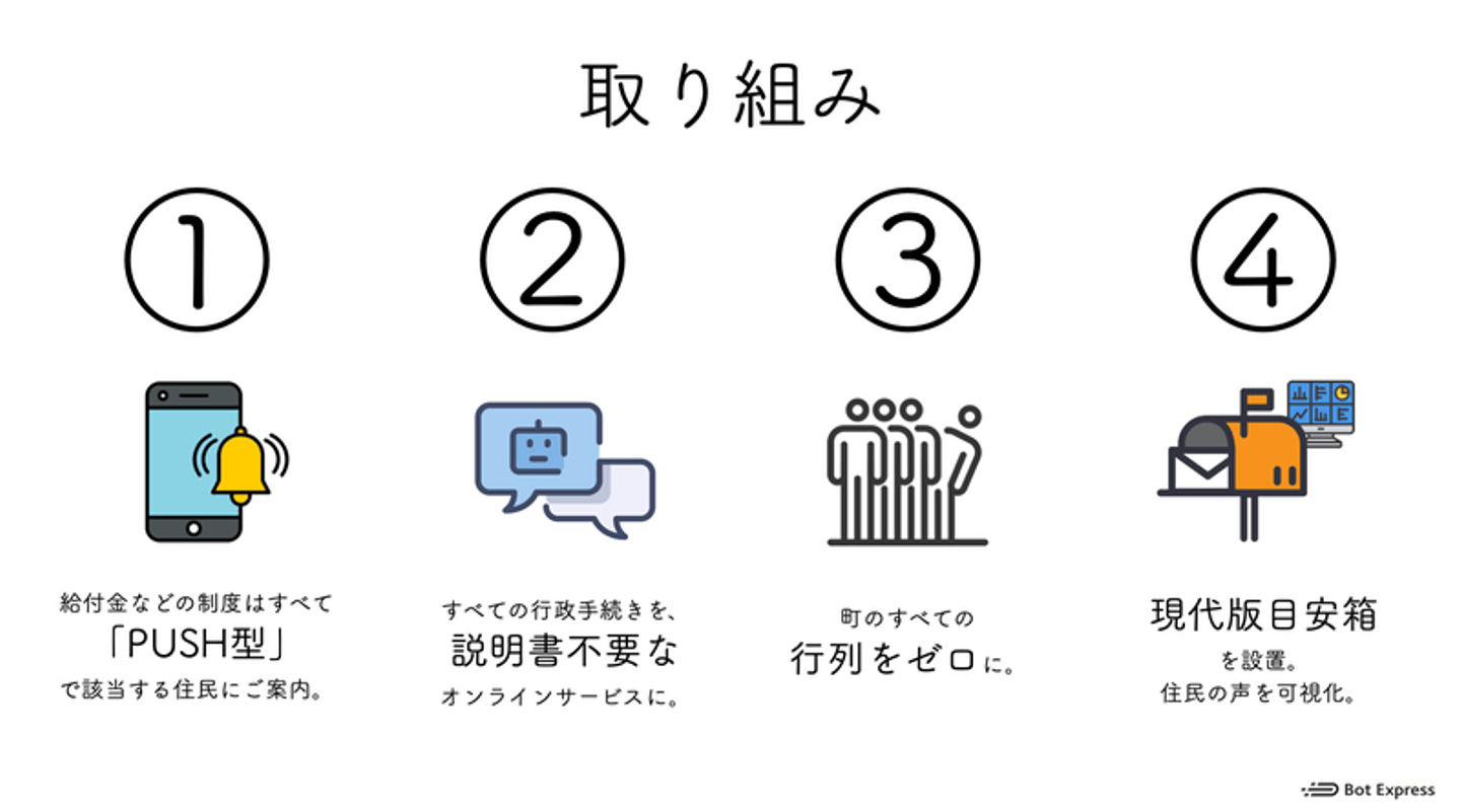単なる手続きのオンライン化ではなく、住民サービスを「掲示+申請」から、「プッシュ通知+確認」へ。
