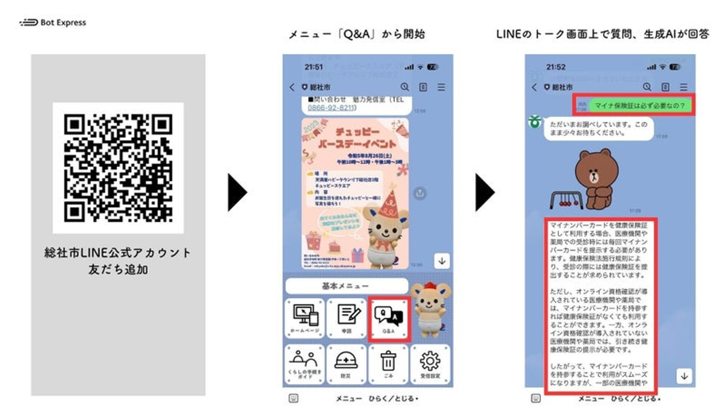 岡山県総社市とBot Expressは、2023年7月20日に開設した総社市スマホ市役所において、生成AIを用いた対話応答型サービスを開始することをお知らせいたします。まずは、住民の関心が高いマイナンバーカードと健康保険証の一体化に関する疑問の解消に向けた「マイナンバーカードによる健康保険証利用に関する問い合わせ対応」機能を公開します。