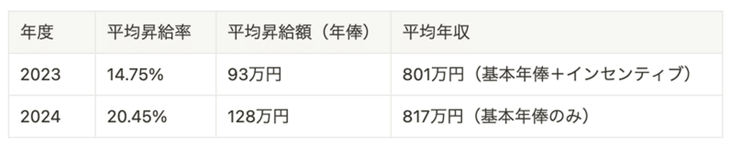 平均年収は基本年俸と支払い済みのインセンティブ(詳しくは後述)の合算金額です。昇給率の割には2023から2024年にかけて平均年収があがっていませんが、これは2024年はまだ支払い済みのインセンティブがなく、基本年俸のみで算出しているためです。