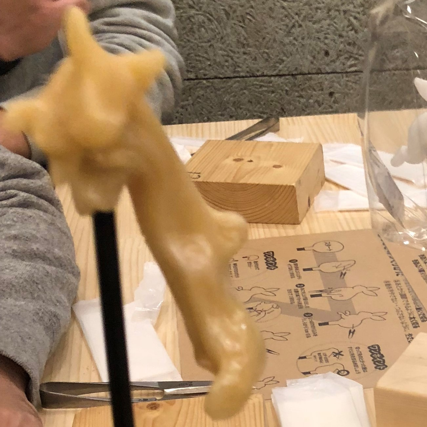 写真右が見本のウサギです。見本と先生からのアドバイスをもとにまずは2回ほど練習で作ってみます。練習用の飴は繰り返し使っているので焦げて白色ではなくなってしまうそうで、まずは練習2回、その後3回目が本番、本番は食べられる白色の飴を用意していただけるとのことでした。