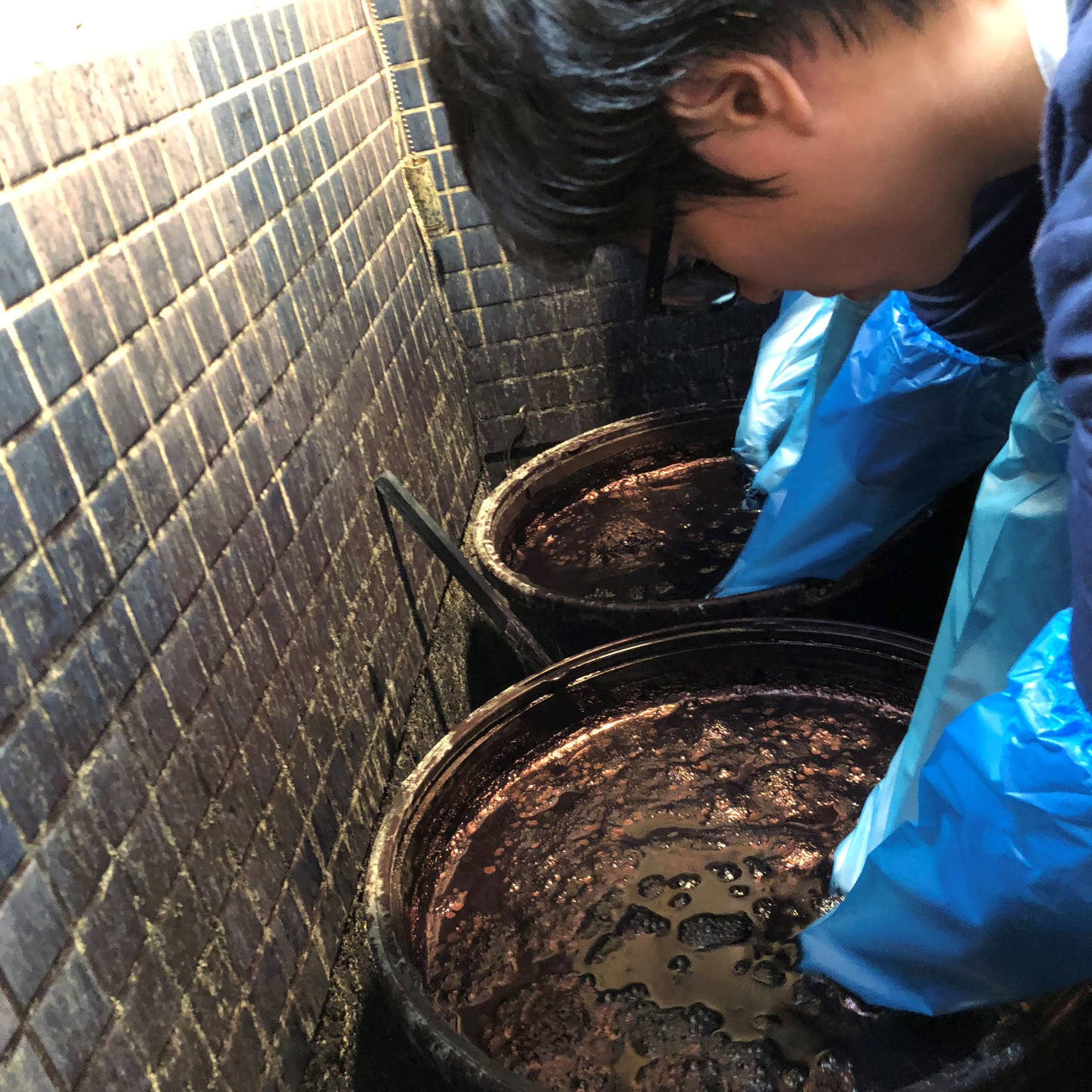 それぞれ、カバンを折ったり、曲げたり、ねじったり、輪ゴムで縛ったりした後、写真のように何度も液体に付けて染めていきます。