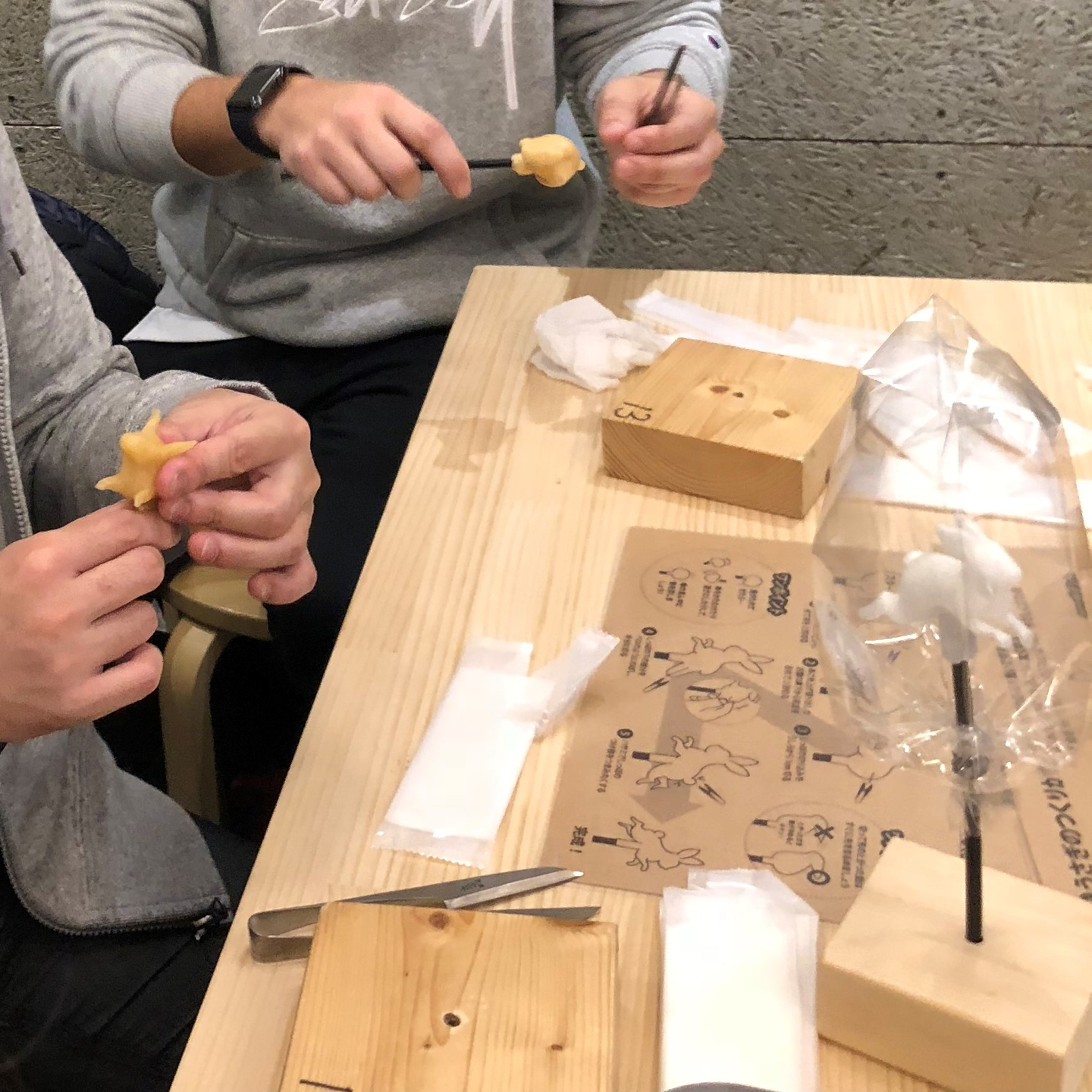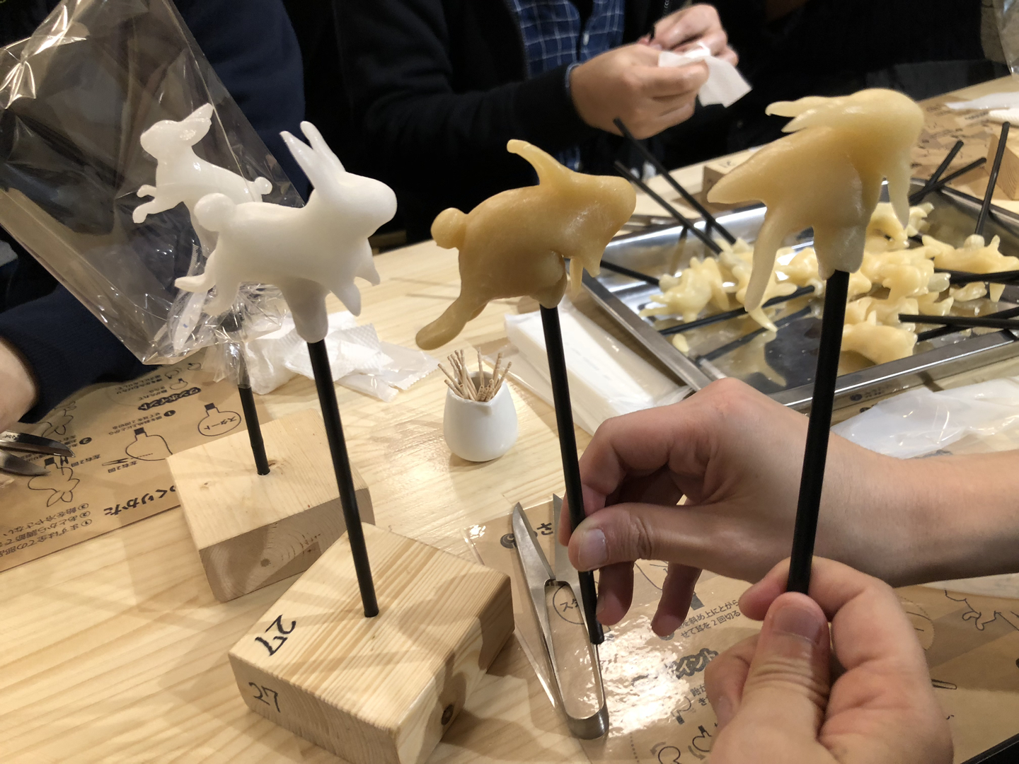 こちらでは飴細工職人ならば誰しもが最初に習得するという、ウサギの飴細工を教えていただき、実際に作ってみました。自分で作ったウサギは持って帰ることができるのですが、きれいに作って飾るか、失敗して食べるかここからは2択のようです。