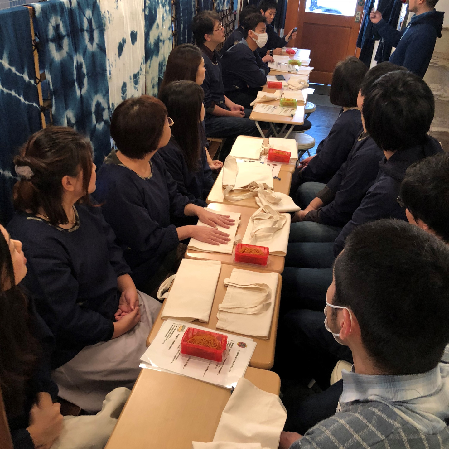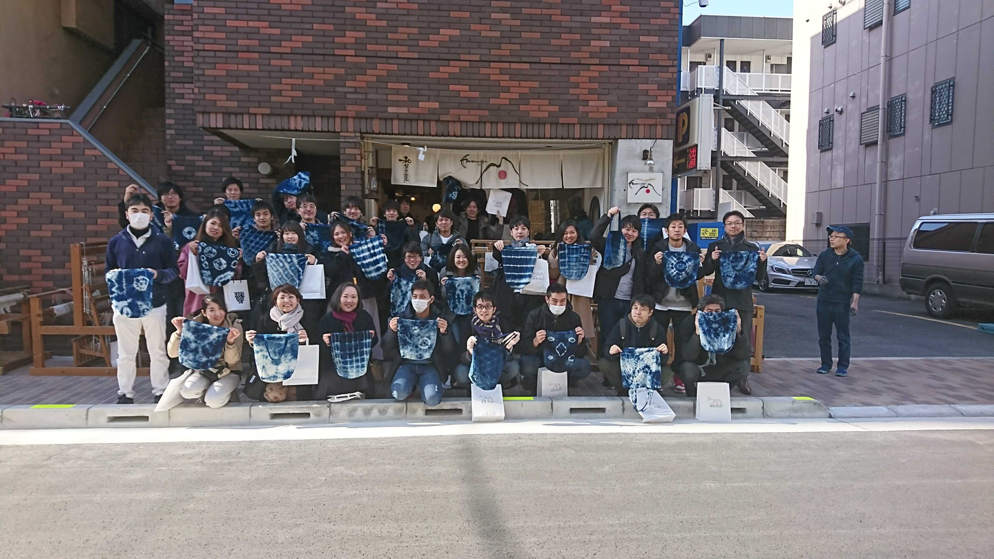 お店のご主人が若干心配そうにブレイン・ラボ社員を見守ってくれている中、出来上がった藍染めをもってみんなで集合写真を撮り次の目的地に移動します。