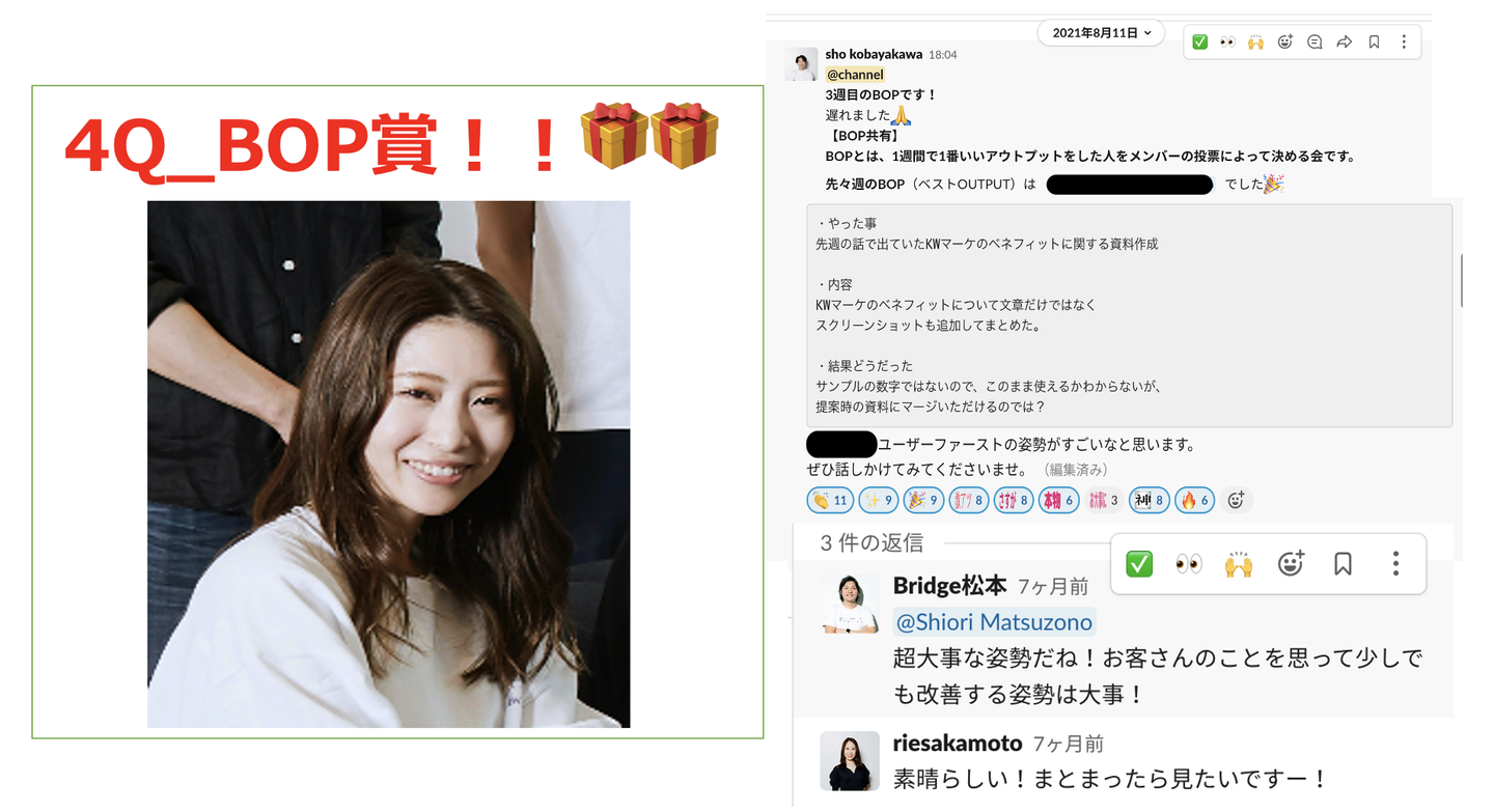 ※BOP賞は「ベストOUTPUT」の略。メンバーの投票によって、1番いいアウトプット、成果を残したメンバーを賞賛する社内賞です。
