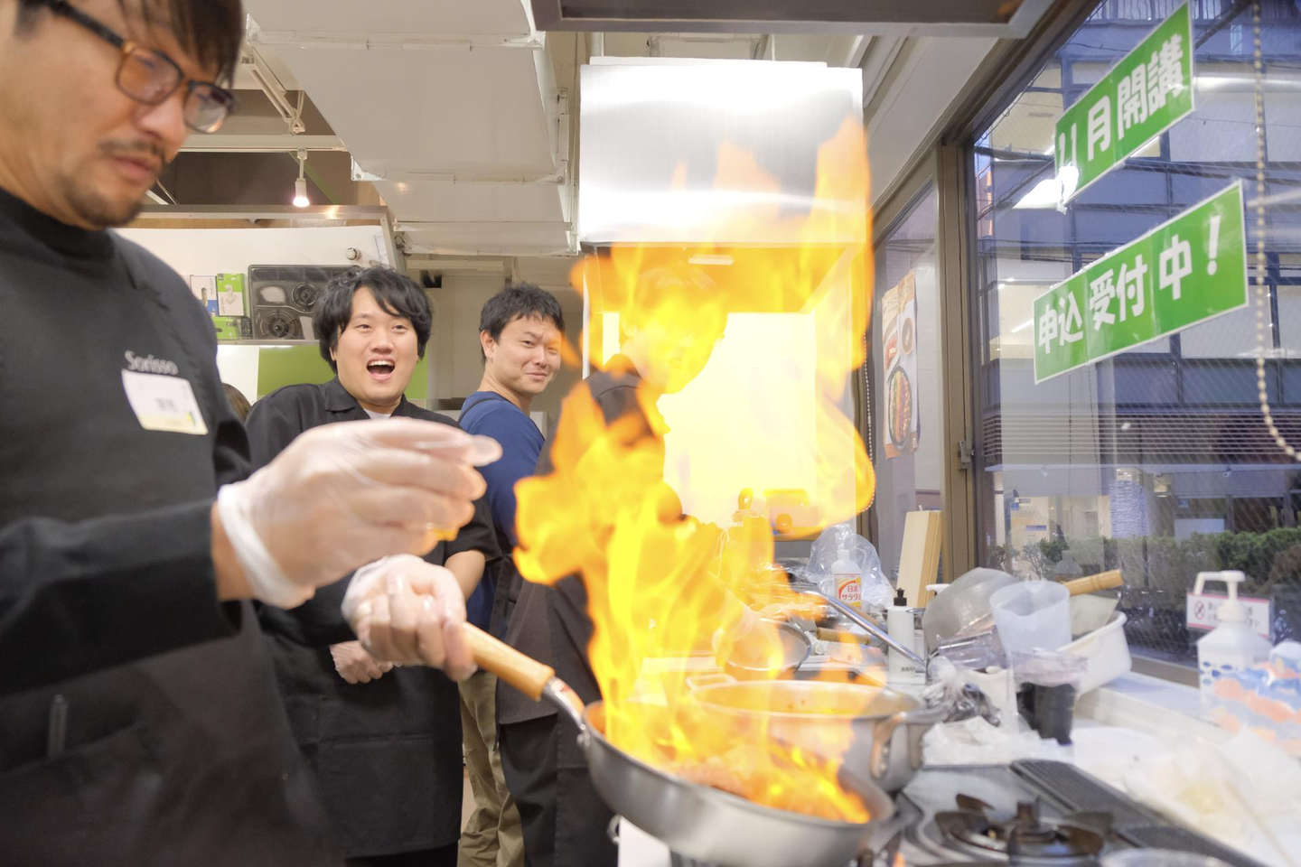 これぞプロの技!?レクチャーで取得したプロのフランベを早速実演しています。