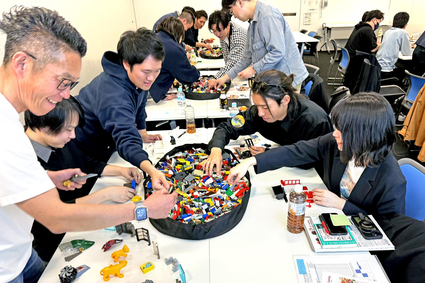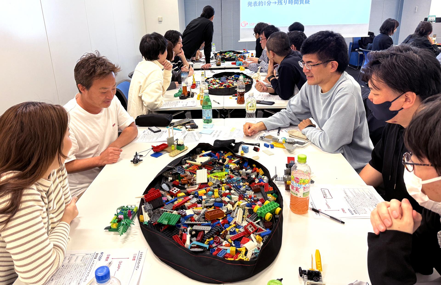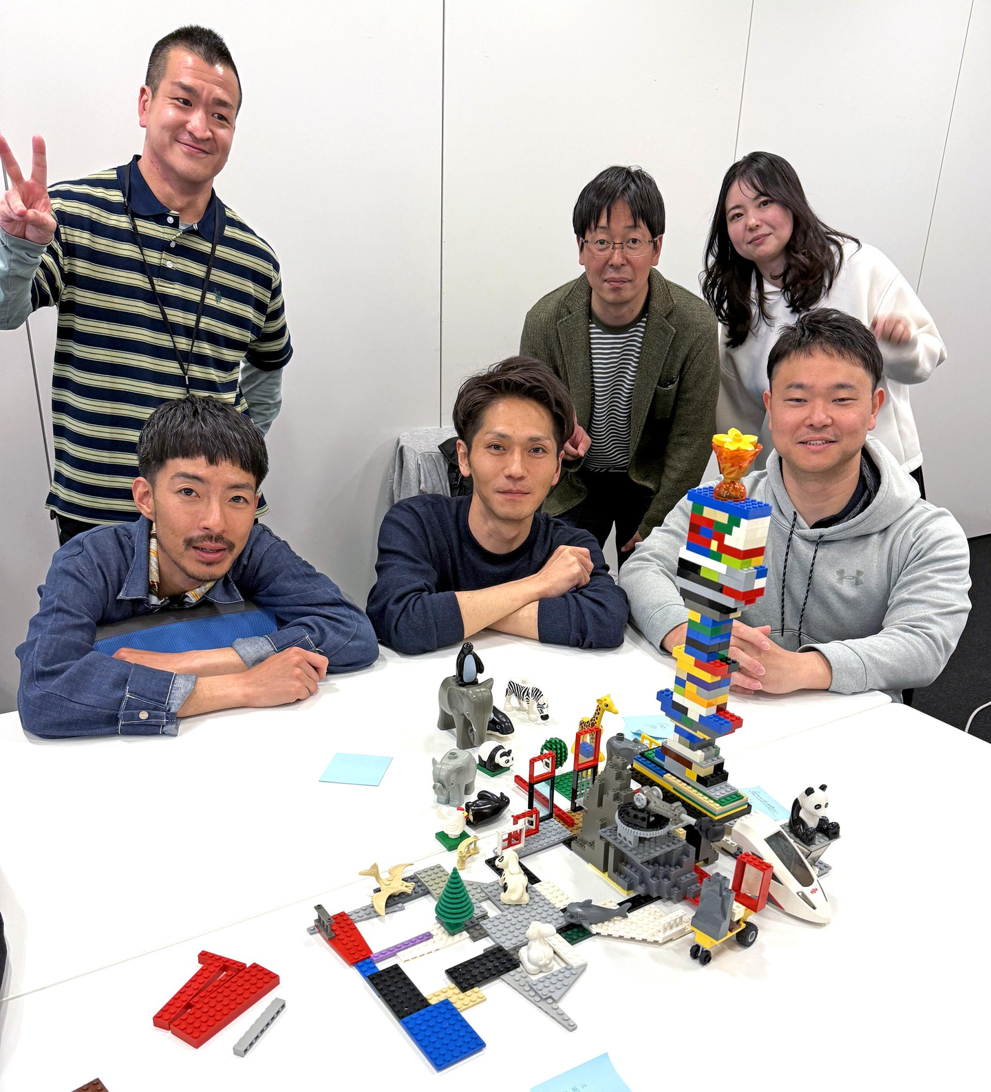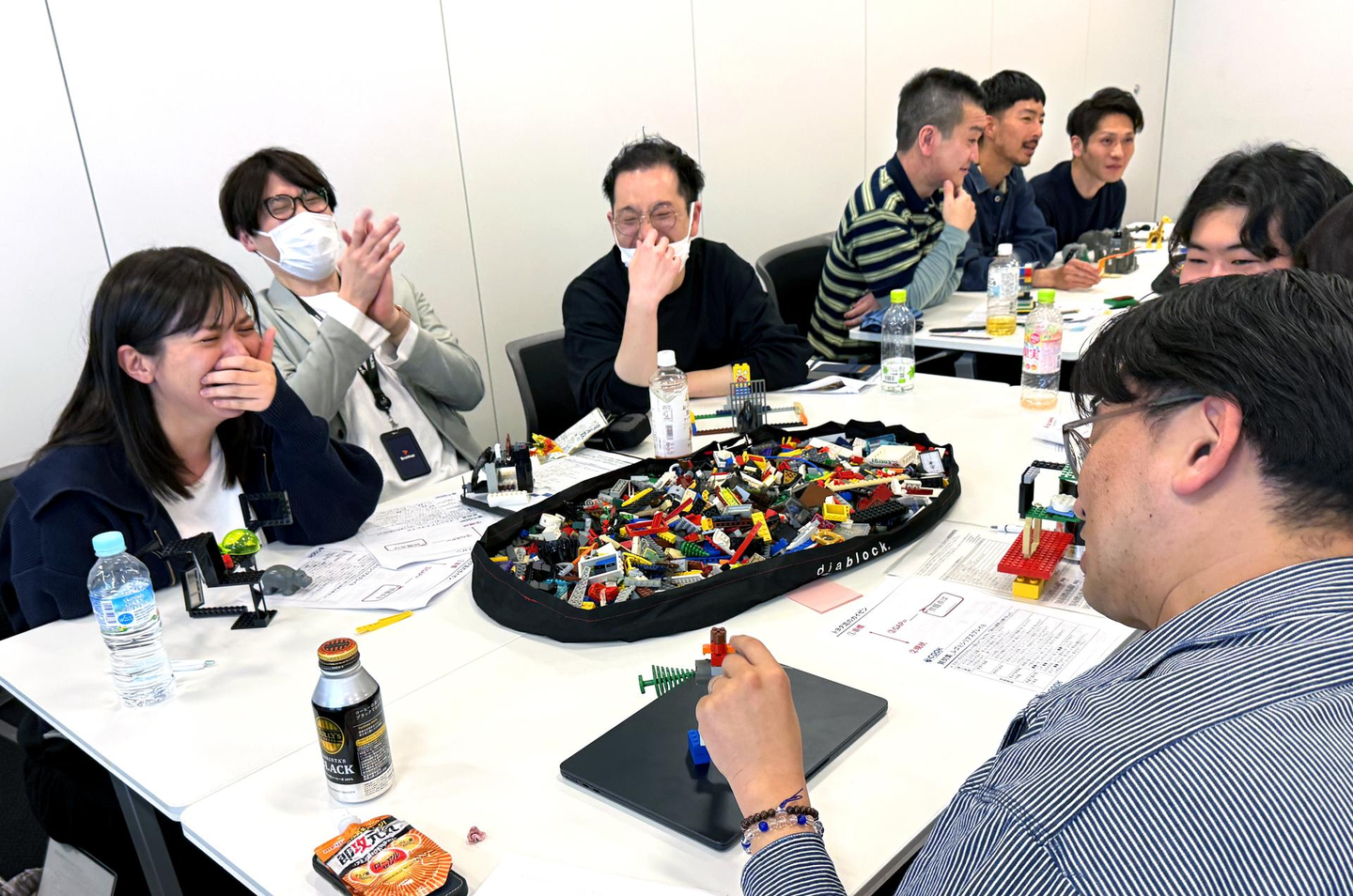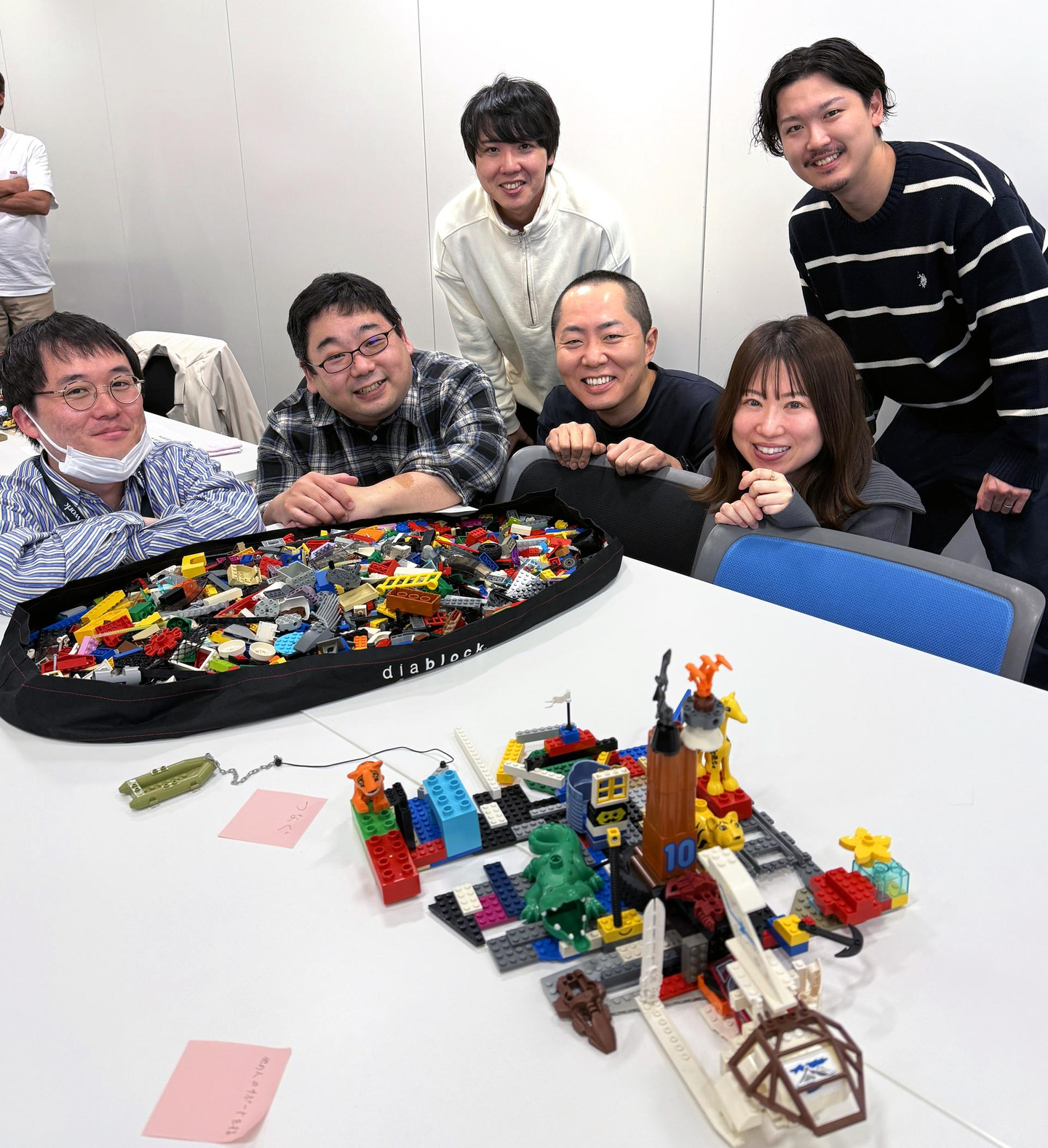 作品づくりが終わったあとは、レゴ®ブロックから少し離れて、メンバー同士でポジティブなフィードバックを送り合う時間。「その考え方、すごく素敵な視点ですね」「意外と大胆なところがあるんですね!」と、自分の一面を褒められることで、自己肯定感がぐっと高まる効果が。4時間を超える長丁場にもかかわらず、全員が集中を切らすことなく取り組む姿に、ファシリテーターを務めていただいた外部講師の方から「ここまで全員が真剣に取り組む会社はめったにないです!」とお褒めの言葉をいただきました。
