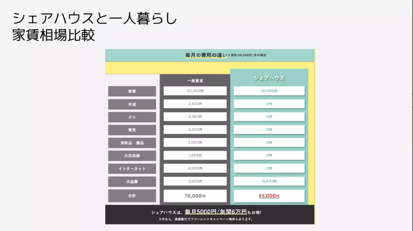 毎月かかる費用を見るとやはり1人で住むよりシェアハウスの方が圧倒的に安いという印象があるのですが、実際いかがでしょうか?
