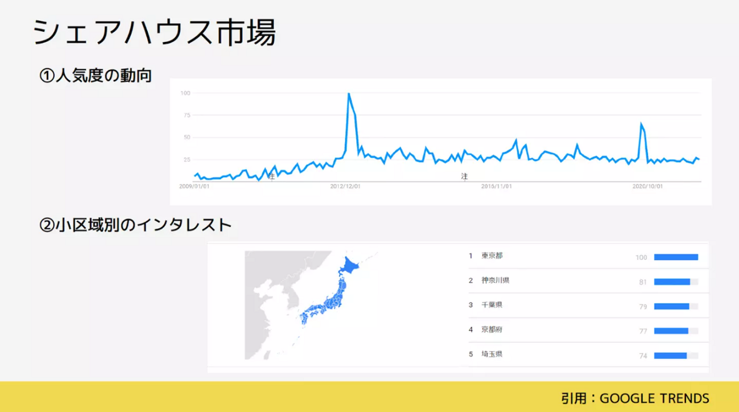 一つ面白いデータがあって、シェアハウスの市場をGoogleのトレンド検索ツールを使って調べたところ、2012年で検索回数が大きく上昇、2020年には東京や神奈川、千葉での検索が非常に増えています。