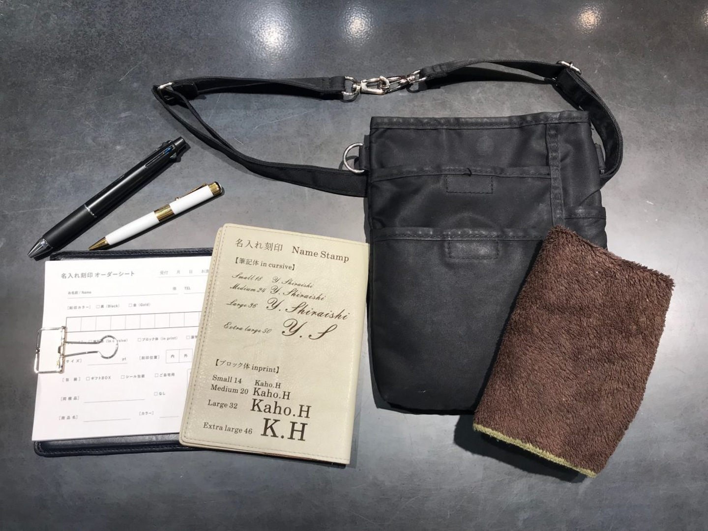—オカダさんの腰にある小さなバッグ。そのなかには商品のオーダーシートの束、刻印の見本革、革を拭きあげるタオルまで。