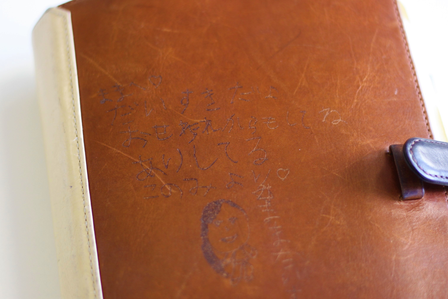 (照れ臭そうにみせてくれた手帳には、「ままへ♡だいすきだよ おせわこれからもしてね あいしてる♡」思わず笑みがこぼれる娘さんからのメッセージが)