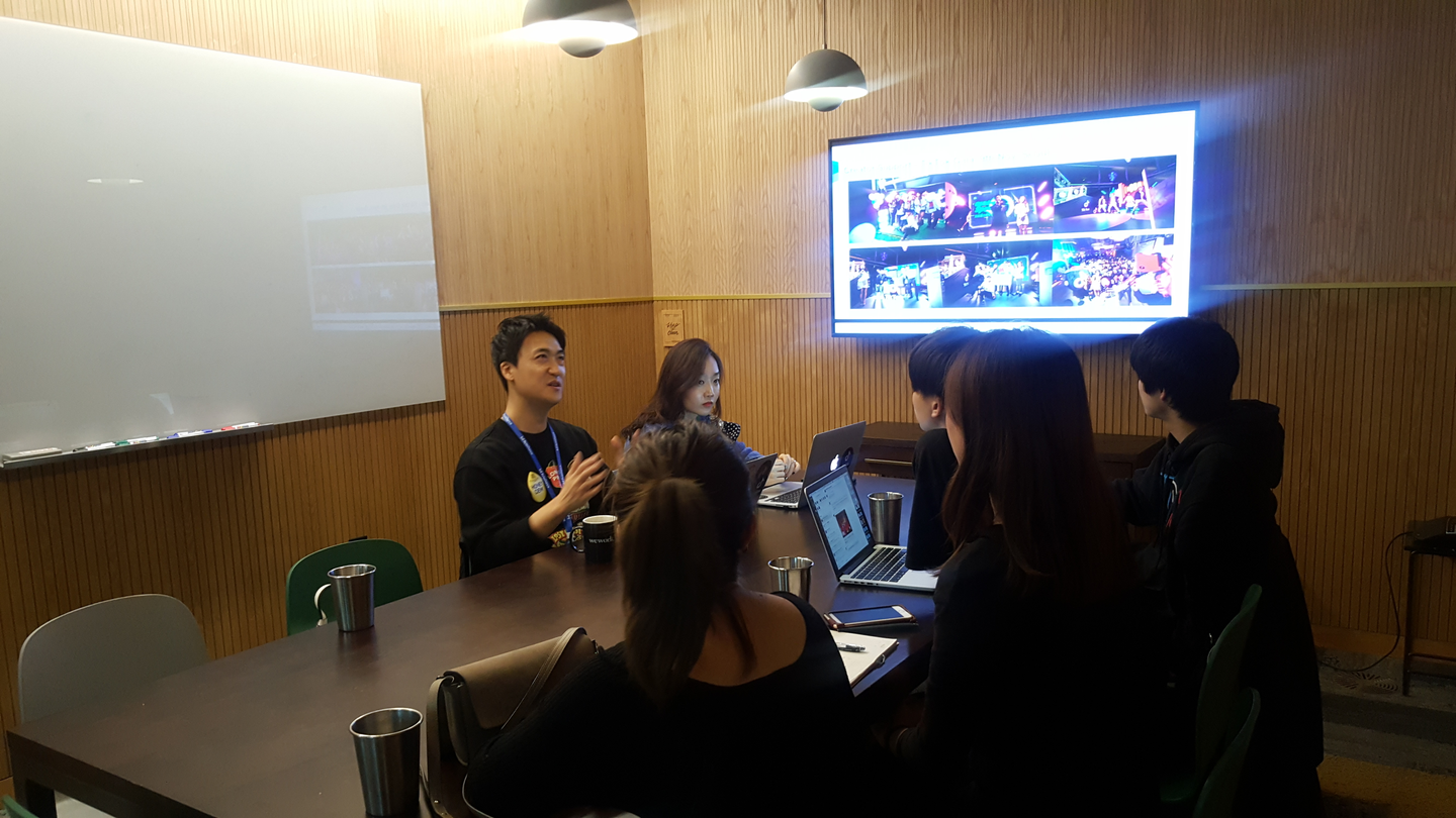 早速プレゼンの始まりです。メディア、音楽、エンターテイメント業界で15年以上勤めているジェイは、豊富な知識や経験をバックグラウンドに、インターン生たちに韓国マーケットのプロジェクトを紹介し、これからの展望を熱く語りました。