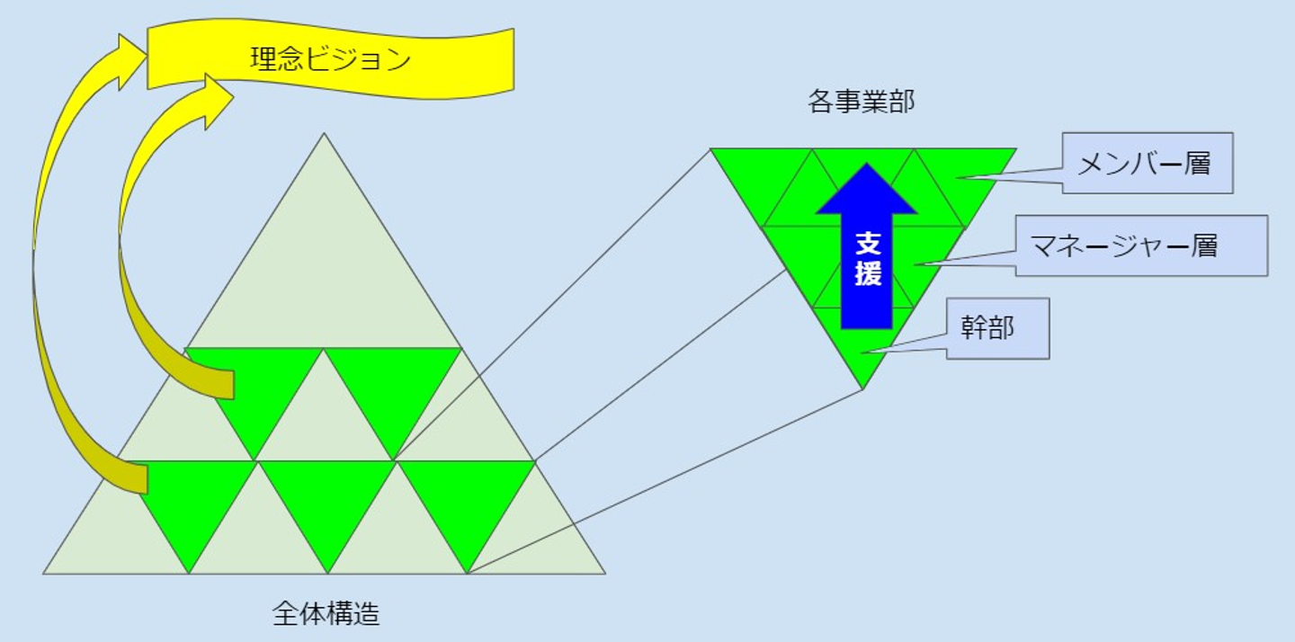 組織の全体構造としては経営をトップとしていますが、各事業部は逆三角の構造で回っている状態が望ましいと考えています。