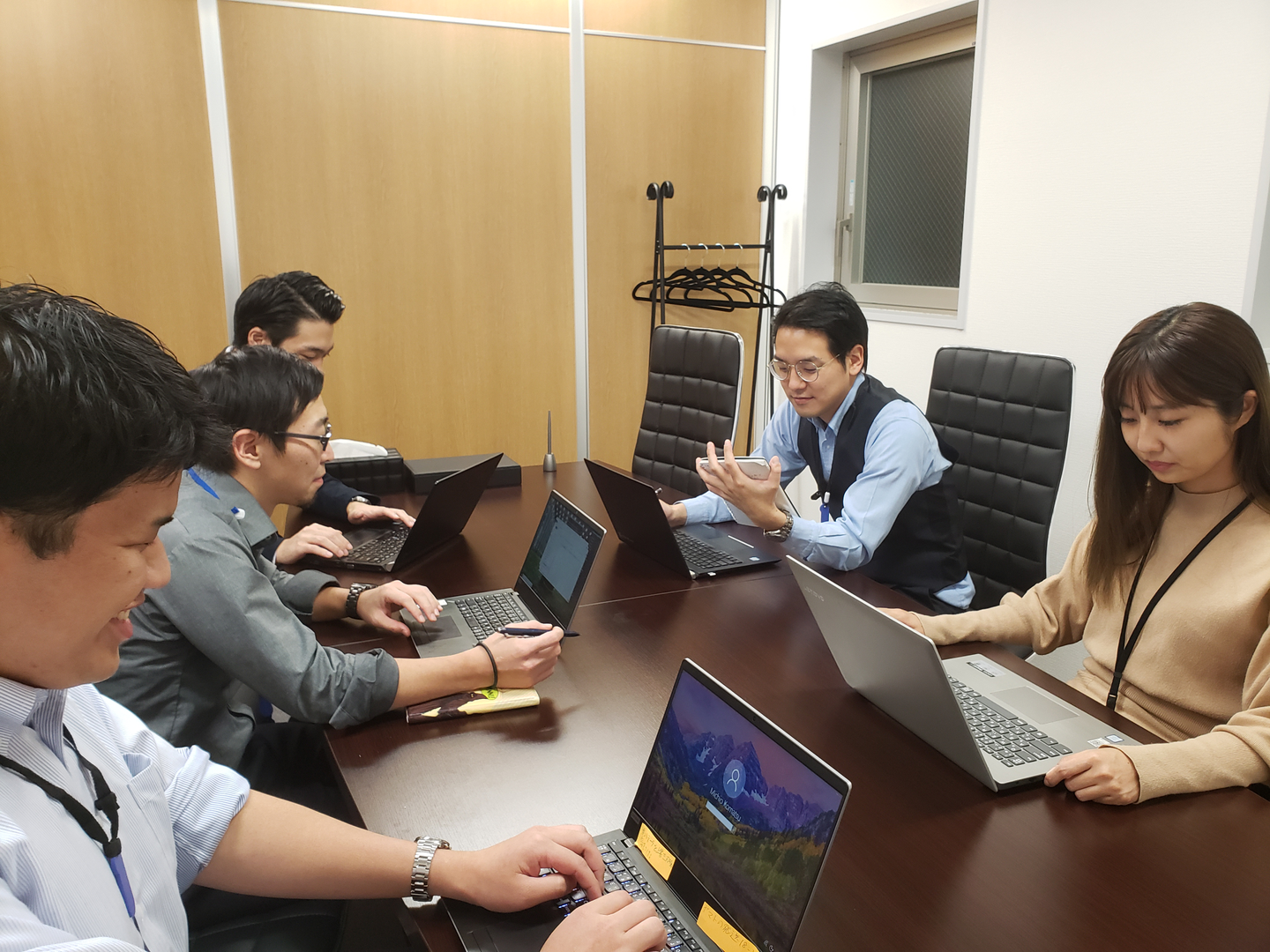 ▲笑顔でログインする小松さん(左側手前)とアクセルファクターの皆さん