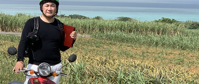 この画像、何をやっているんだろう……と思われた方Wanted!? このWantedlyのカバー画像を撮影するために原付きバイクで沖縄県小浜島内をめぐる代表です。撮影時期は新型コロナウィルス感染症が国内全体で深刻化する前の2月。寒い冬を温かいこの島で過ごそうとする旅行者も少なくありませんでした。気温は27℃。画像はパロディですが、クオリティを高めようとスイカのヘルメットも新品を用意し、小浜島の美しい風景をバックにPCの充電ができるスポットを探している様子を感じ取っていただけると嬉しいです。詳しくはブログで!