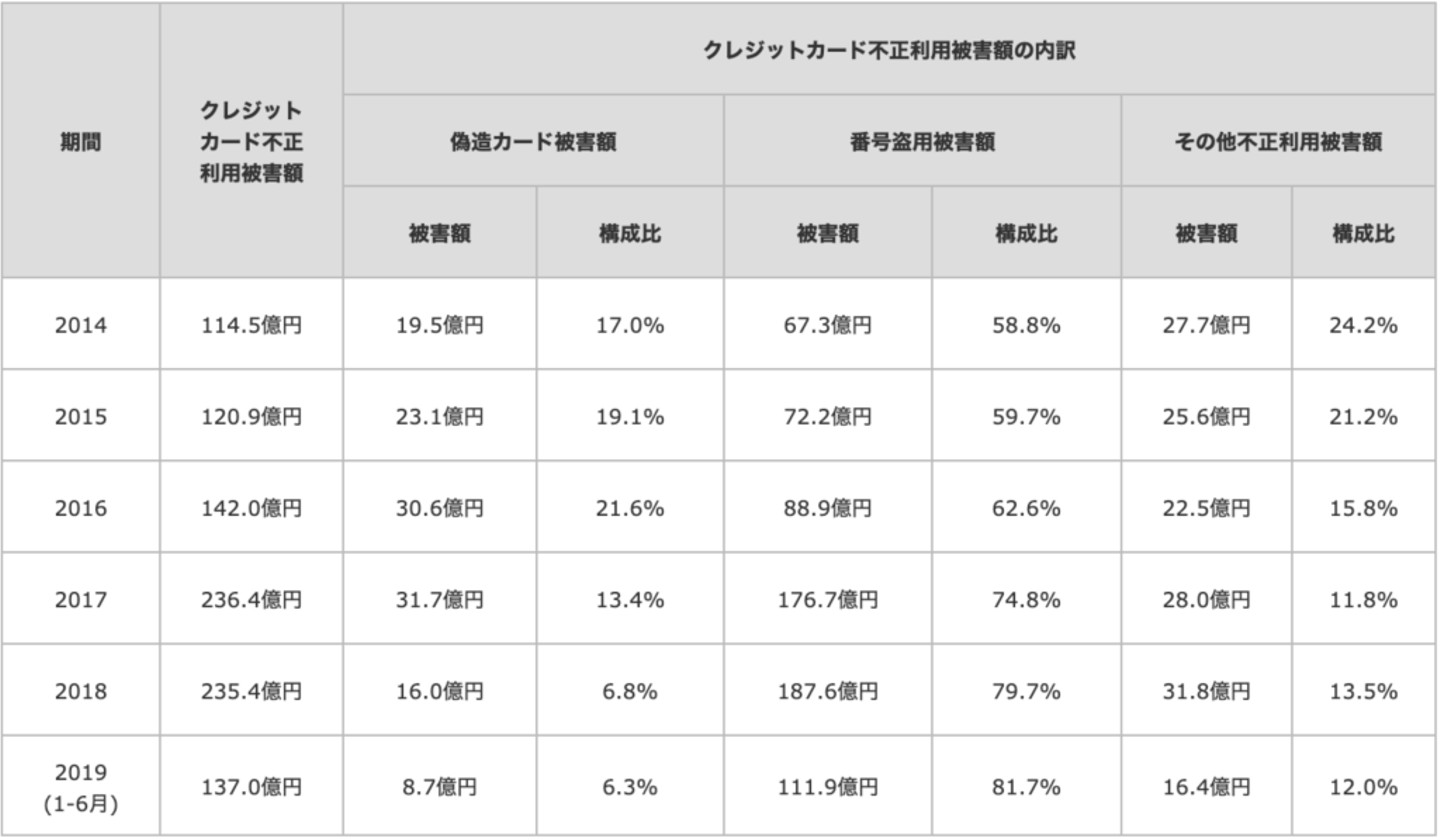 とくにクレジットカード番号の盗用による不正被害額は、被害額全体の81.7%。2019年上半期だけで111.9億円という額にまで及んでいます。