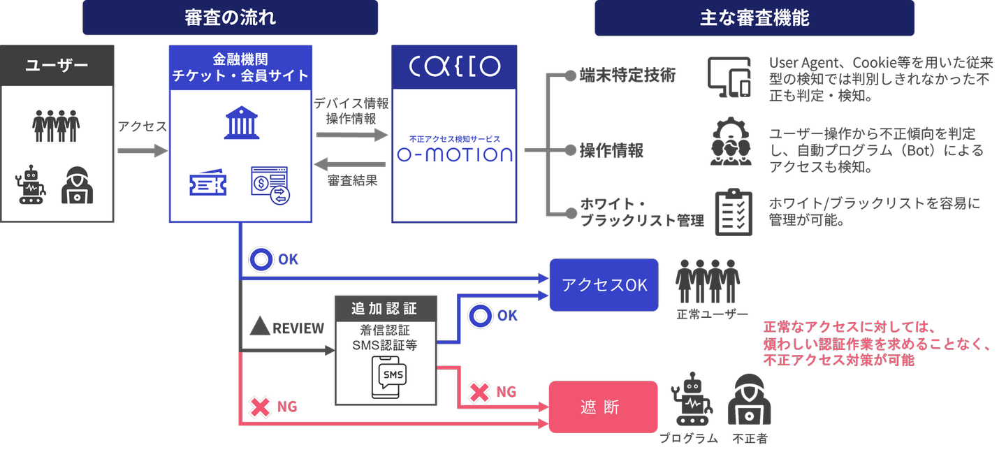 - 購入時の氏名・住所・電話番号・商品情報などの多くの項目を審査に利用するO-PLUXとは違い、ログイン時のIDと端末情報しか活用できないため、高い端末特定の検知精度を保つことが難しかった