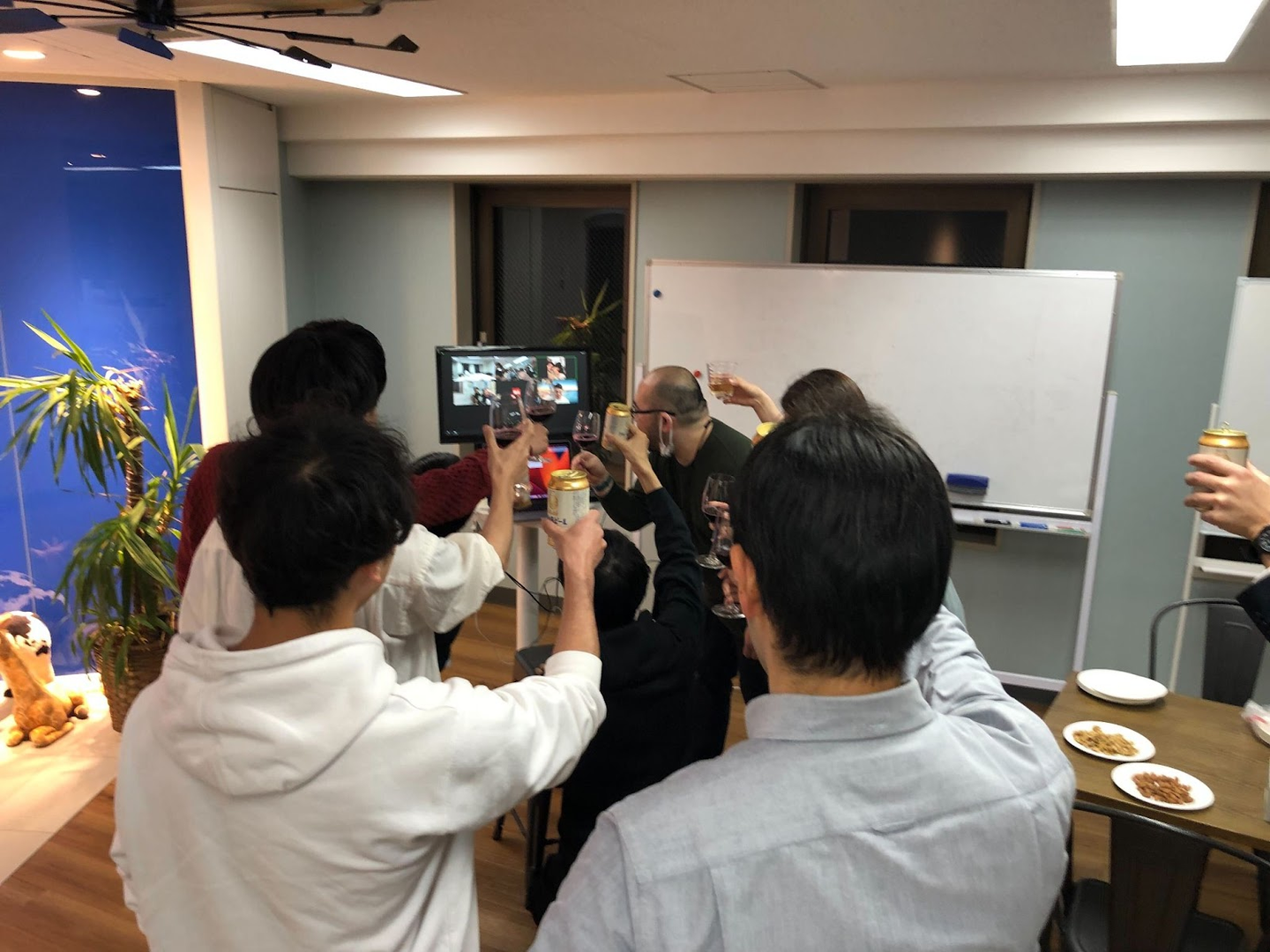 テレビ会議を繋いで遠隔地の社員やお子様がいてオフィスに来れない社員も一緒に乾杯!