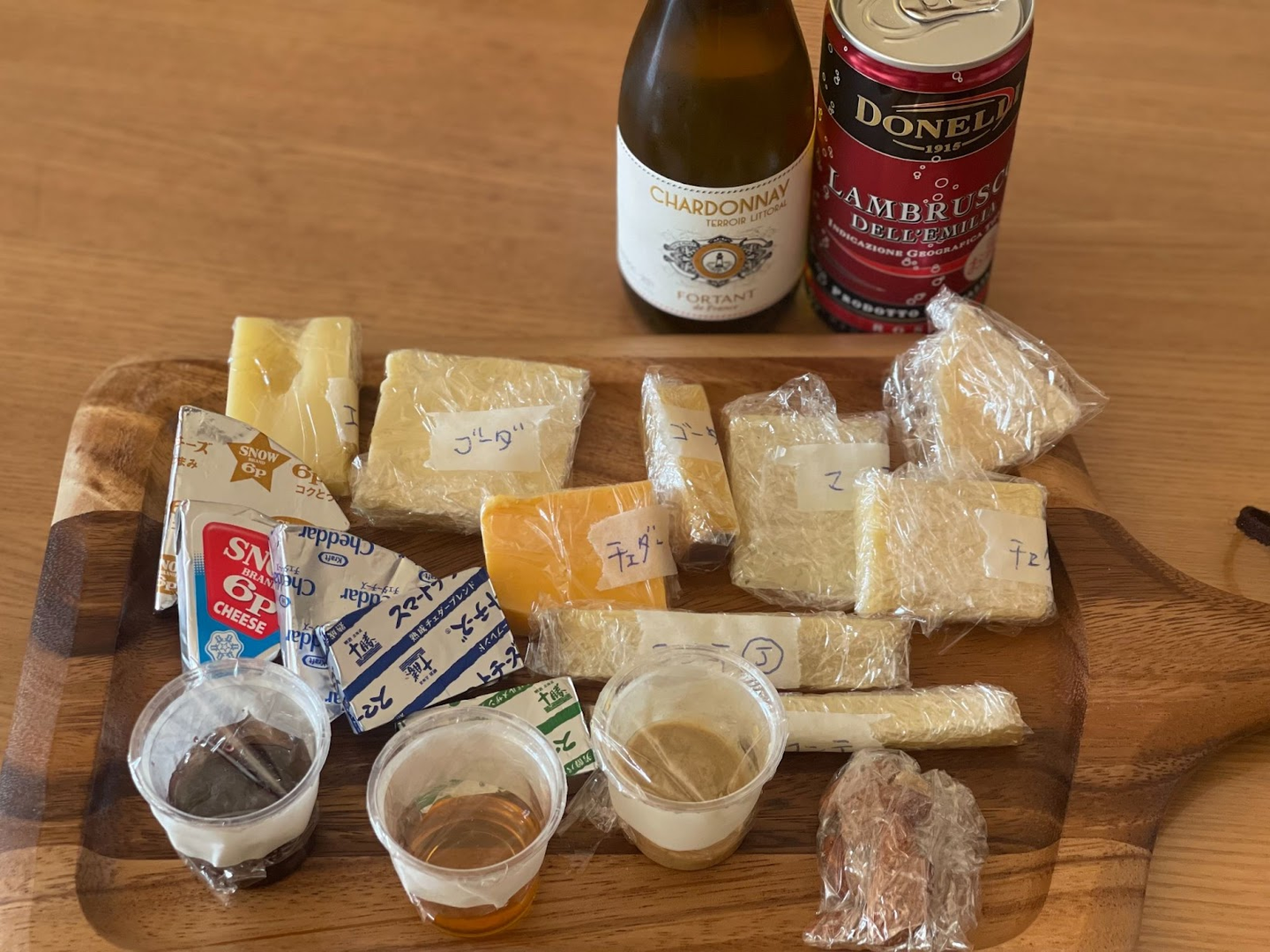オフィスのカフェスペースで、チーズなどの食べ比べをしながらみんなで楽しくお喋りをする「食べ比べ部」。食べ比べ部は毎回オンライン参加もOKとなっており、オンライン参加者には自宅に写真のようなチーズと飲み物のセットが届きます!