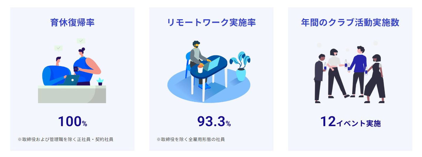 先ほどご紹介した「遠隔地居住制度」とあわせて、かっこでは関東圏に居住する従業員についてもリモートワークメインで勤務をしています。リモートワーク実施率は、1年間の全従業員の勤務日数を分母、1年間の全従業員のオフィスへの出社日数を分子にして算出したのですが、リモートワーク実施率が90%を越えていてびっくりしました。(ちなみに人事の私は週1回オフィスに出社しているので実施率は80%程です!)