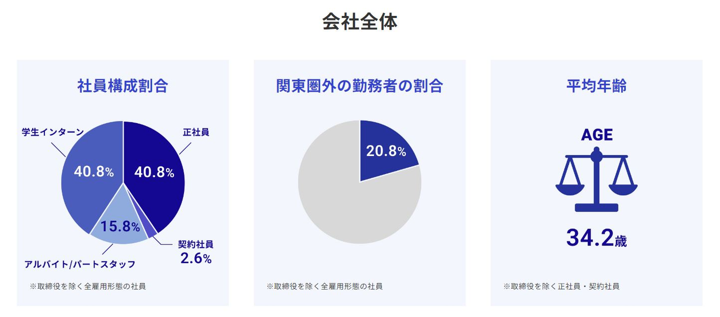 また、雇用形態を問わず関東圏外からの勤務が可能な「遠隔地居住制度」を設けており、日本だけに限らず、海外に居住する正社員、学生インターンが在籍しています。