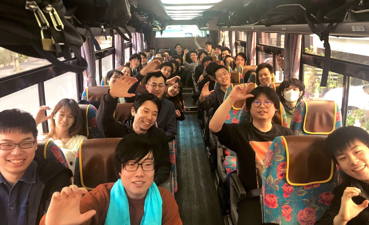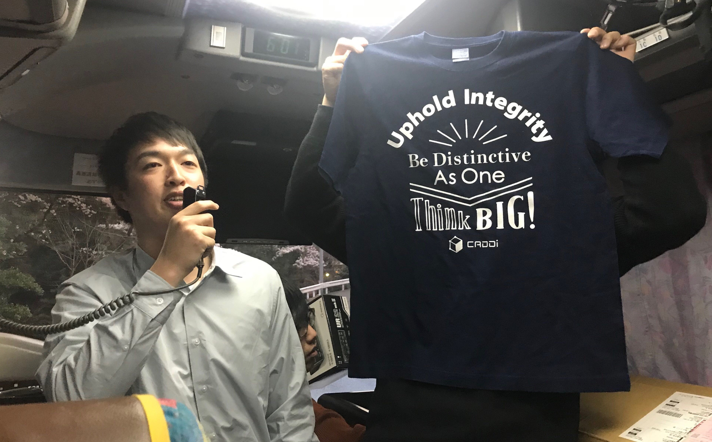 キャディ一丸TRIPは平日開催ということで、1日目は普段通り営業日。全員で16時にオフィスを出発しました。実はこのバスの席順、事前アンケートで「話したいキャディメンバー」で回答した人ができる限り隣同士になれるように組まれたもの!すでにバスの中から交流は始まっていたんです。バス内では事前アンケートのメンバーのそれぞれへの印象が発表されたり、今回の合宿のためにインターン生主導で作成された「一丸TRIP Tシャツ」のお披露目が行われ、宿に向けて徐々に熱気が高まっていきました。