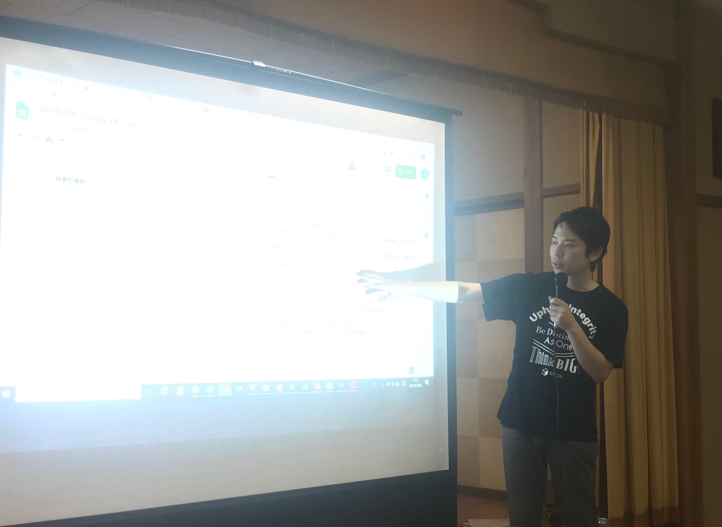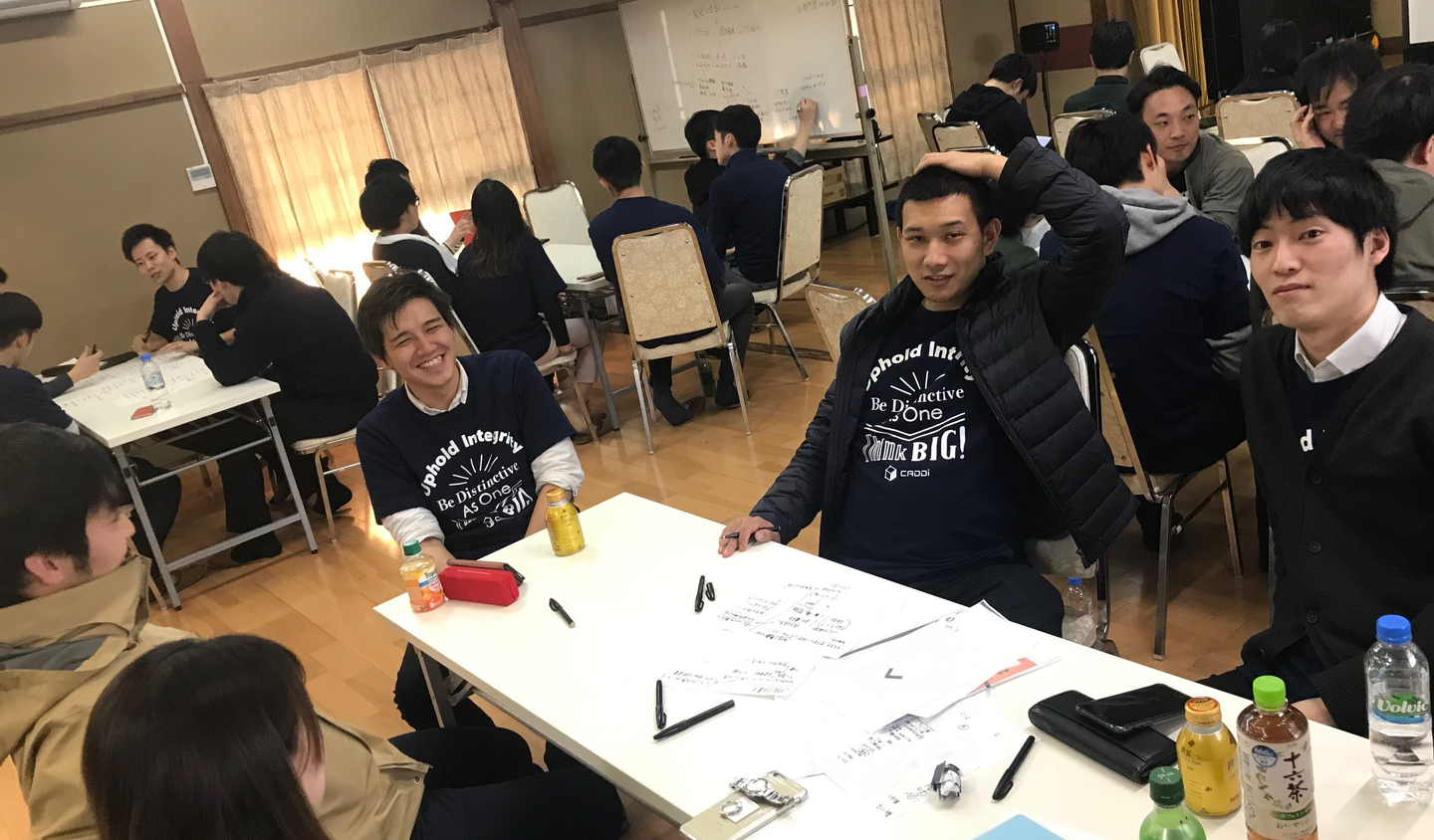 2日目の午前中に行われたのは「キャディカルチャーダイアログ」。現在のキャディの「カルチャー」とはどのようにできてきたのか、についての理解を深めることを目的とし、創業メンバーの加藤・小橋・幸松からキャディ創業時〜現在までの歴史を語ってくれました。中には創業当時「受注しちゃったけど、塗装のパートナーさんがいない!」と1日で200件の塗装屋さんに電話し、何とかお願いすることができた、、、といった数々の泥臭いエピソードも。まだ創業1年半年という短い歴史ですが、それでもとても濃い歴史があり、それらが現在のキャディに繋がっていると感じられました。