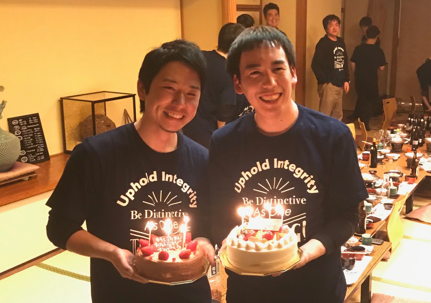 キャディの創業者、CEOの加藤とCTOの小橋は2人とも4月上旬が誕生日ということで、キャディメンバーで2人のお祝いをしました。1人1つのケーキを前にニコニコですね(^^♪