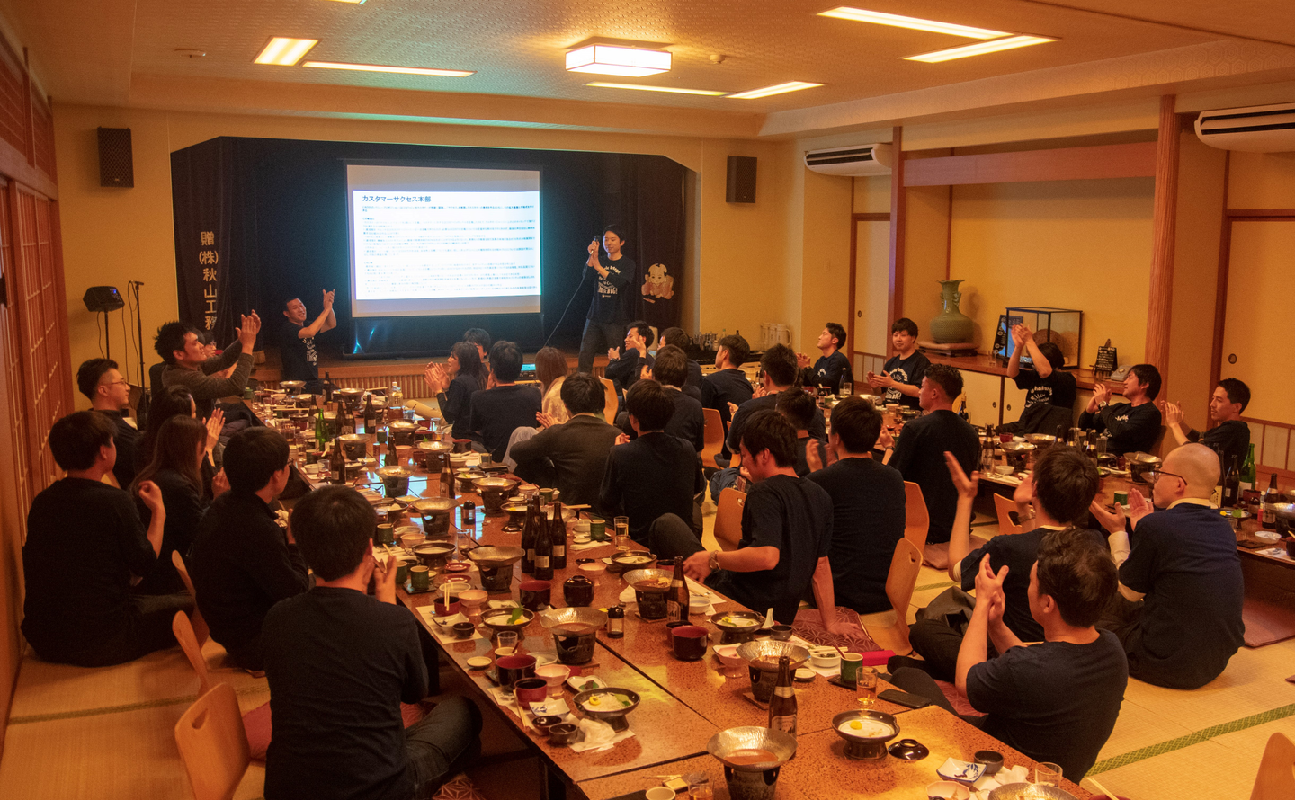 夕食をいただいた後には四半期、そして年度のOKRの振り返りを全員で行いました。チームごとにどのようなことを達成したのかを発表・確認し、お互いの健闘を称えあいつつ、全社への理解を深めました。